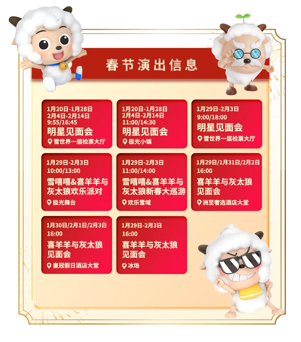 雪嘻嘻携手喜羊羊与灰太狼,联袂上演明星见面会、欢乐派对、新春巡游等精彩演出接收这份演出时间表,来和他们偶遇互动吧!