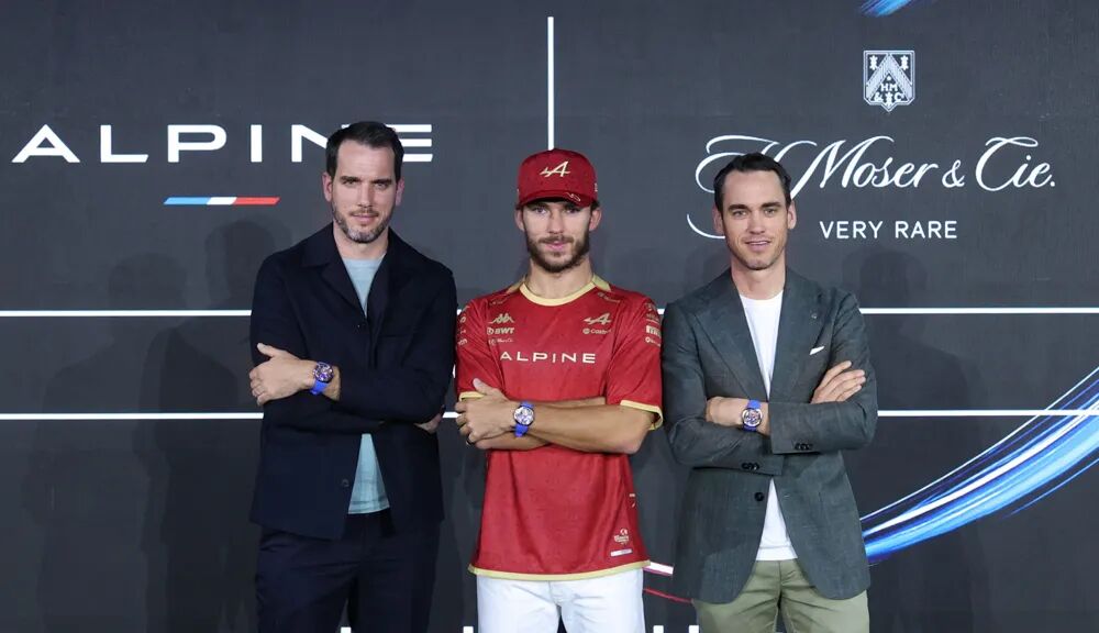 活动现场,亨利慕时首席执行官爱德华·梅朗(Edouard Meylan)及品牌共同所有人、MELB LUXE子公司首席执行官伯特兰·梅朗(Bertrand Meylan)与Alpine F1车手皮埃尔·加斯利(Pierre Gasly)共同揭幕Streamliner疾速者系列圆柱游丝陀飞轮镂空腕表Alpine限量版,富有创造力与镂空机械美感的全新时计于沉浸式氛围中重磅揭晓。