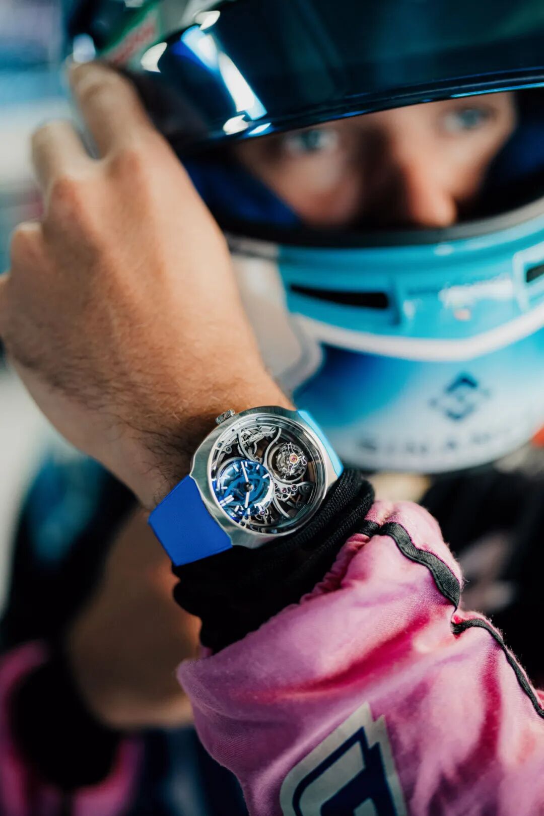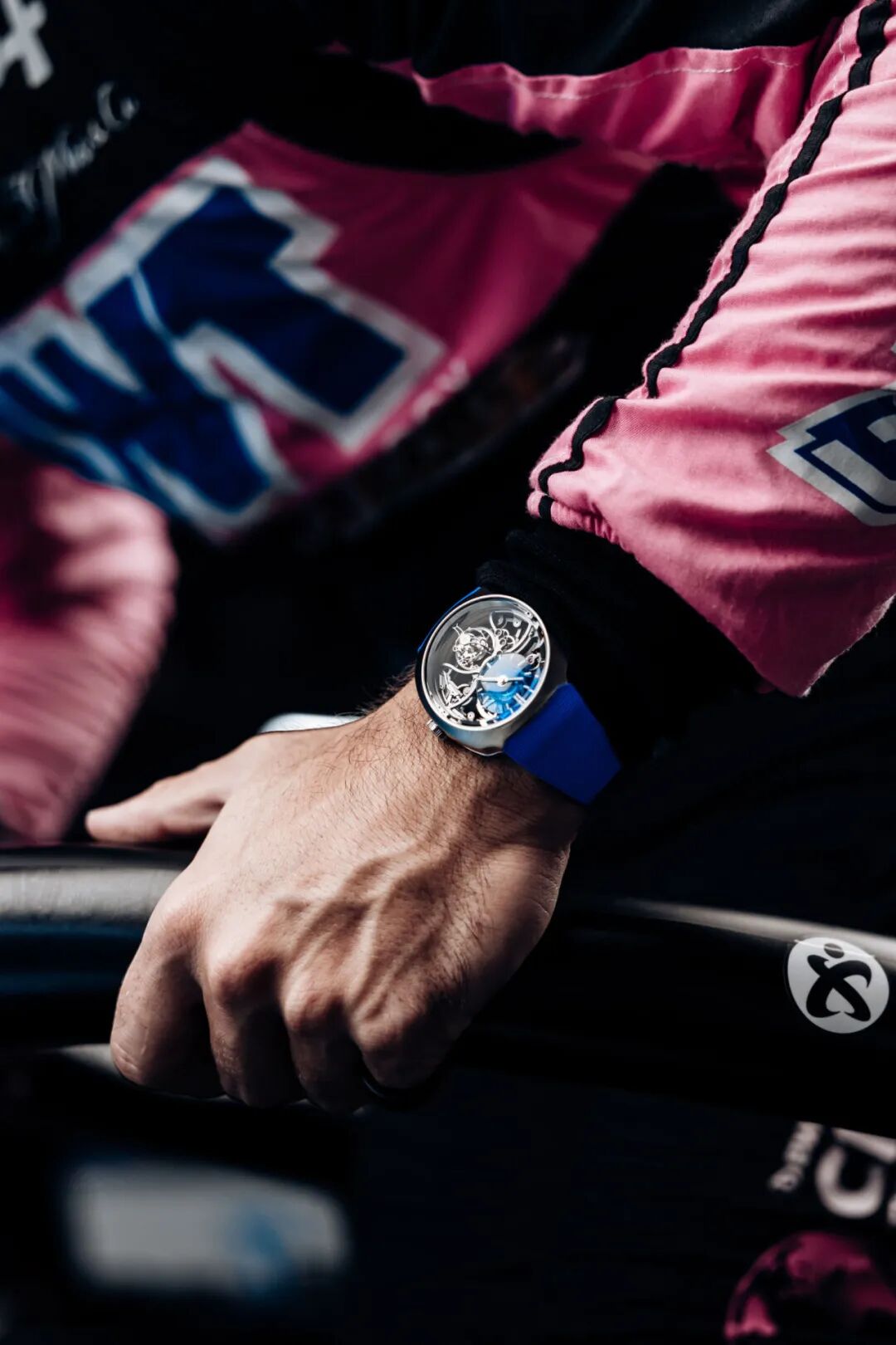 位于12点位置的镂空主表盘上方可见半透明的弧形小表盘,采用清澈的合成尖晶石制成亨利慕时及Alpine Motorsports的标志性蓝色,这种材质加工难度极高,却为腕表带来明亮而独特的色调,成为点睛之笔。腕表仅在背面镌刻品牌名称,展现其独特性和纯粹的极简外观。HMC 811自动上链自产机芯的正面及背面均经过完全镂空,可以将大尺寸镂空金质自动盘的摆陀一览无余。轻盈的飞行陀飞轮在蓝宝石水晶镜面下优雅地旋转,更突显这枚机芯的美感。