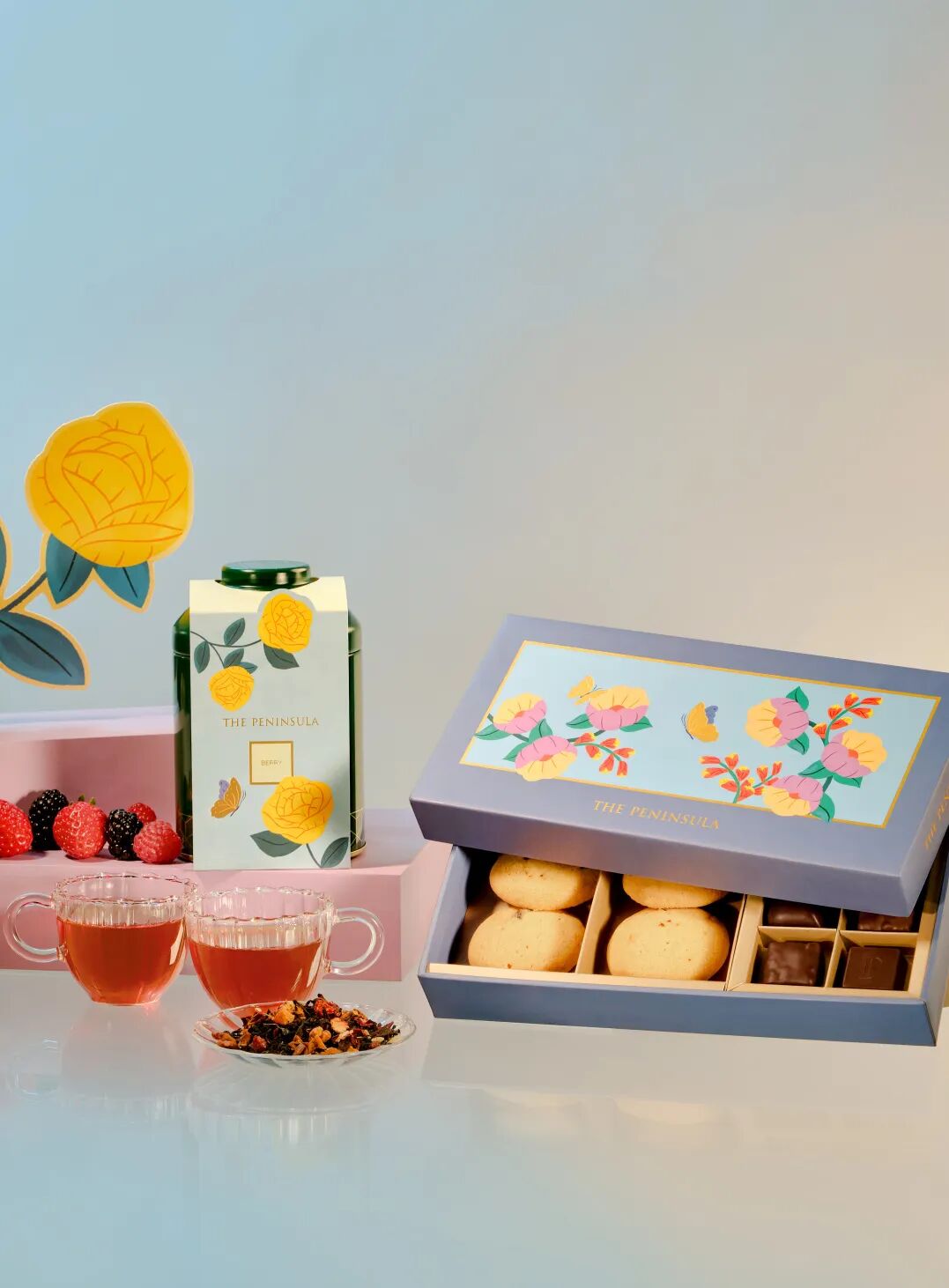 半岛名茶系列的最新成员莓果红茶,以象征友谊和喜乐的季节性黄玫瑰图案包装。以香醇的锡兰茶巧妙调配德国出产的苹果片、红甜菜、接骨木莓、黑莓和树莓,带有清新果香,味道怡人。另有火焰兰礼盒与山茶花礼盒。
