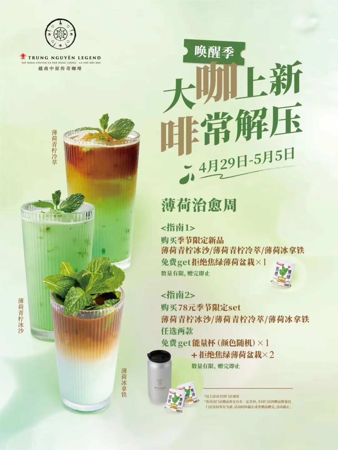 到店任选一杯季节限定新品——薄荷青柠冰沙/薄荷青柠冷萃/薄荷满满拿铁。即可GET[拒绝焦绿]薄荷盆栽,吸口薄荷,神清气爽!任选两款新品,即可Get两个薄荷盆栽和一个随机颜色能量杯!