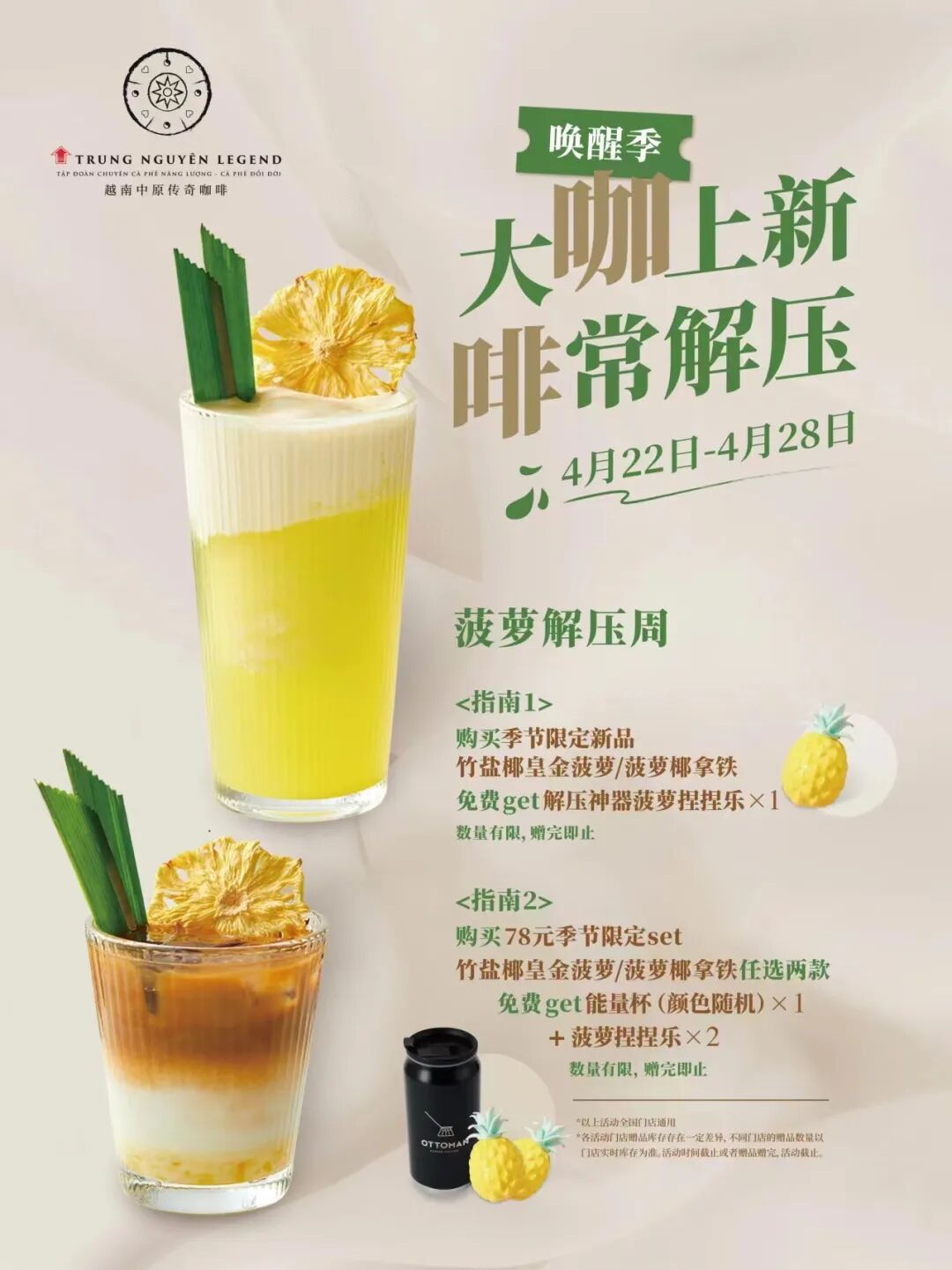 越南中原传奇季节限定新品清爽来袭,用菠萝和薄荷唤醒春夏味蕾!4月22日-5月5日,整整两周,为你带来清新味觉与绚丽视觉的双重享受,治愈心灵,让压力烟消云散。