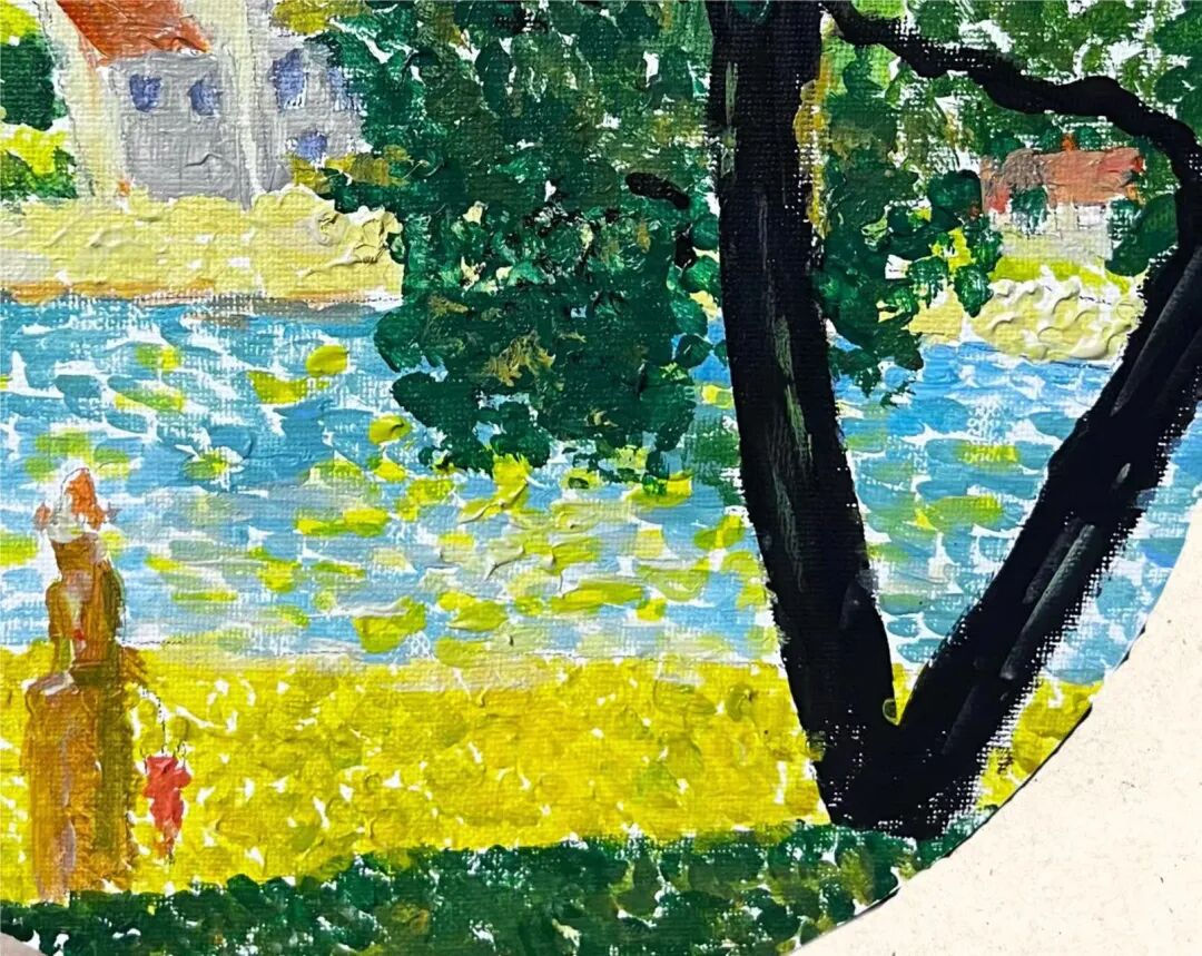 《望舒》这个作品,就是缘起于韩老师曾经在课堂上分享的艺术家高更。梓洛告诉我们,她被艺术家勇敢追求自己艺术梦想的故事深深地打动,又联想到曾经读过的一本书《月亮与六便士》,书中的主人公也是为了梦想努力追求。所以“月亮”便成为她想要创作的“快乐星球”。