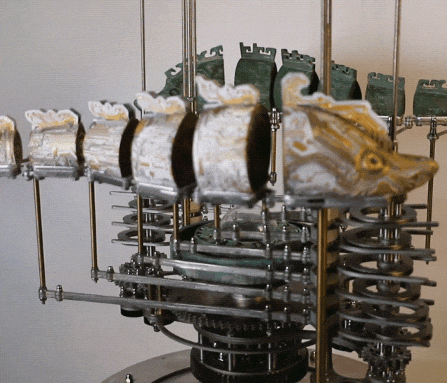 他用机械装置融合传统的太极文化,一阴一阳两尾鱼循环不止,代表过去与未来的循环反复,互为因果。
