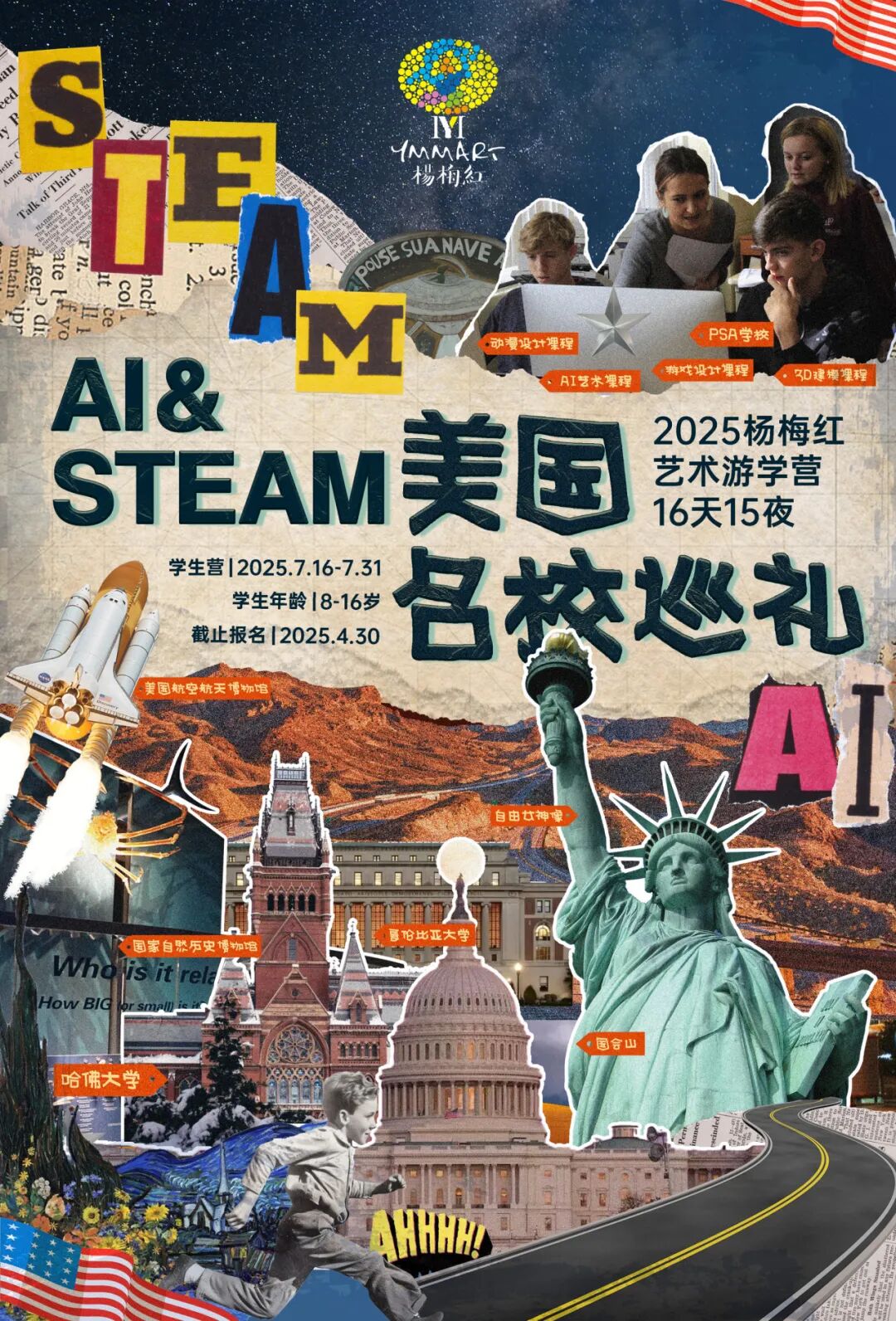 今年暑假,杨梅红特别组织了一场“美国名校巡礼”,带领孩子们前往美国波士顿、费城、华盛顿、纽约等地,参访哈佛、耶鲁、麻省理工学院、马里兰艺术学院、帕森斯设计学院、罗德岛设计学院等多所最重量级的世界名校,体验美式校园寄宿生活,深度学习本土STEAM课程与体育项目:打造个人数字艺术作品,掌握最新AI绘画技术。