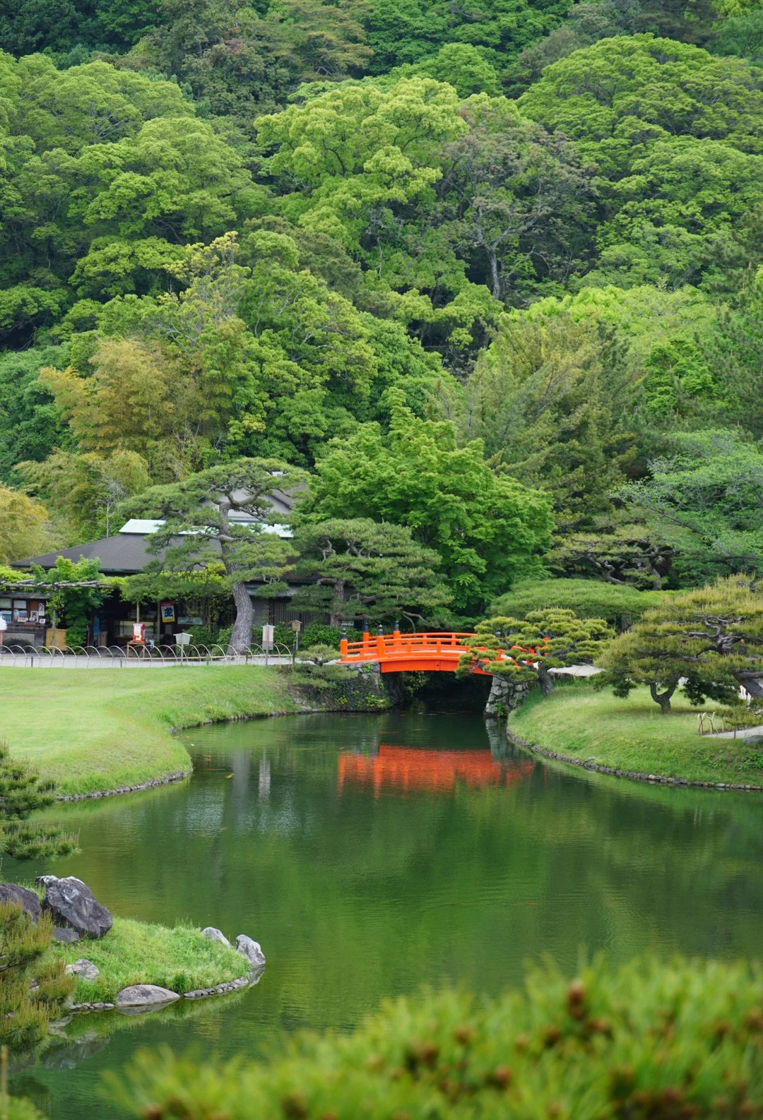 感受过壮观的潮水力量,下午,我们去到日本著名的“回游式大名庭”——栗林公园,感受静态之美。栗林公园建于江户时代初期,距今已有超过400年的历史,是自然与人文结合的典范。公园中,最珍贵也最具特色的是两百多株的“箱松”,树龄皆在两三百年以上,每一株都长得姿态各异,优雅古典,令人赏心悦目。
