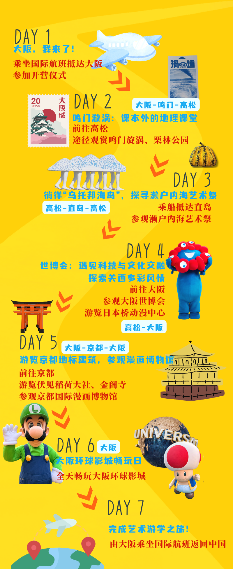 我们会去往高松、濑户内海、大阪与京都,在世界级旋涡奇观与百年庭园之间感受动静之美,探索濑户内海国际艺术祭,在星罗棋布的岛屿上“跳岛游”(Island Hopping),感受自然与艺术的和谐交融,之后,还会参观大阪世博会,游览数百个国家展览馆,体验世界最前沿的科技魅力与创意力量。