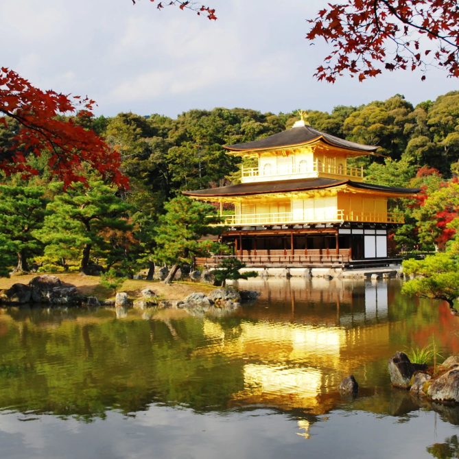 下午,我们首先会去到金阁寺参观,学习了解日本不同时代的建筑风格。金阁寺是一座著名的佛教寺庙,始建于1379年,因建筑物外表覆盖着金箔而得名,20世纪末被评为世界文化遗产。许多人喜爱的动画片《聪明的一休》中,也出现过金阁寺的画面。
