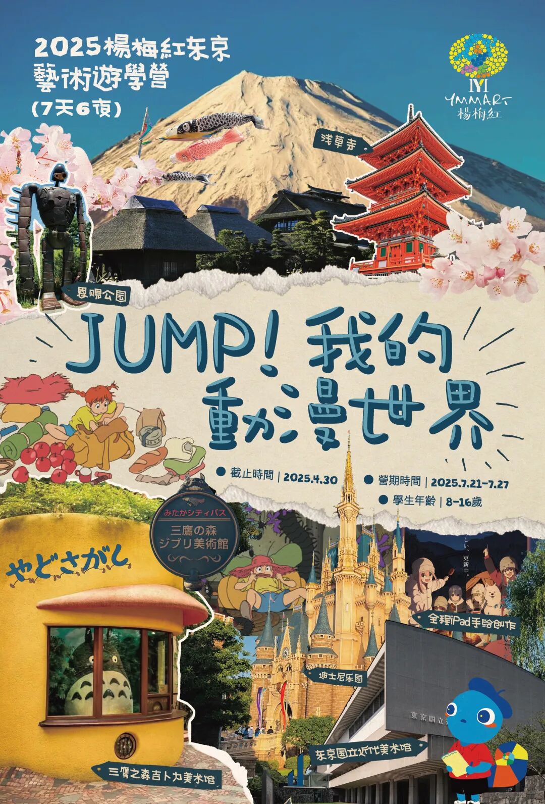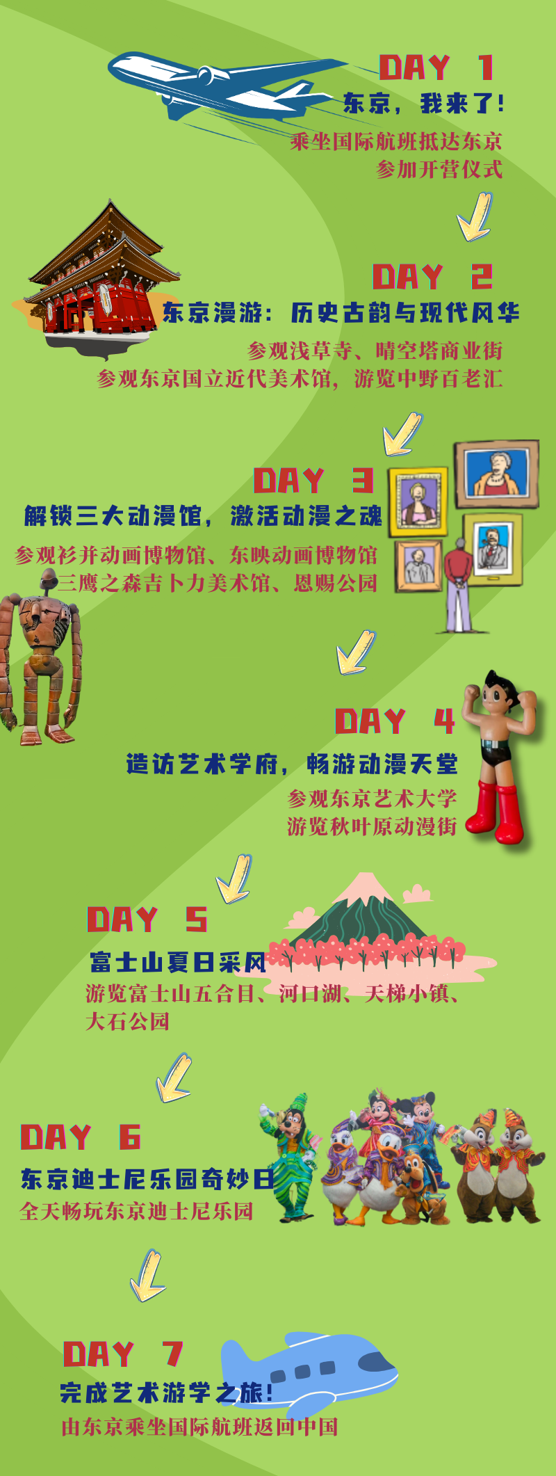 杨梅红小动漫设计师将游览东京地标浅草寺、晴空塔,远眺富士山,穿越至一个个奇妙的二次元世界,偶遇自己心爱的动漫人物;解锁各大动漫专题博物馆,了解动漫大师的崛起之路,学习动画制作流程;探访亚洲知名艺术学府、美术馆,与留学生一起交流、写生;当然,还少不了东京迪士尼乐园,米老鼠、唐老鸭、玲娜贝儿、艾莎公主……都在这里欢迎你!