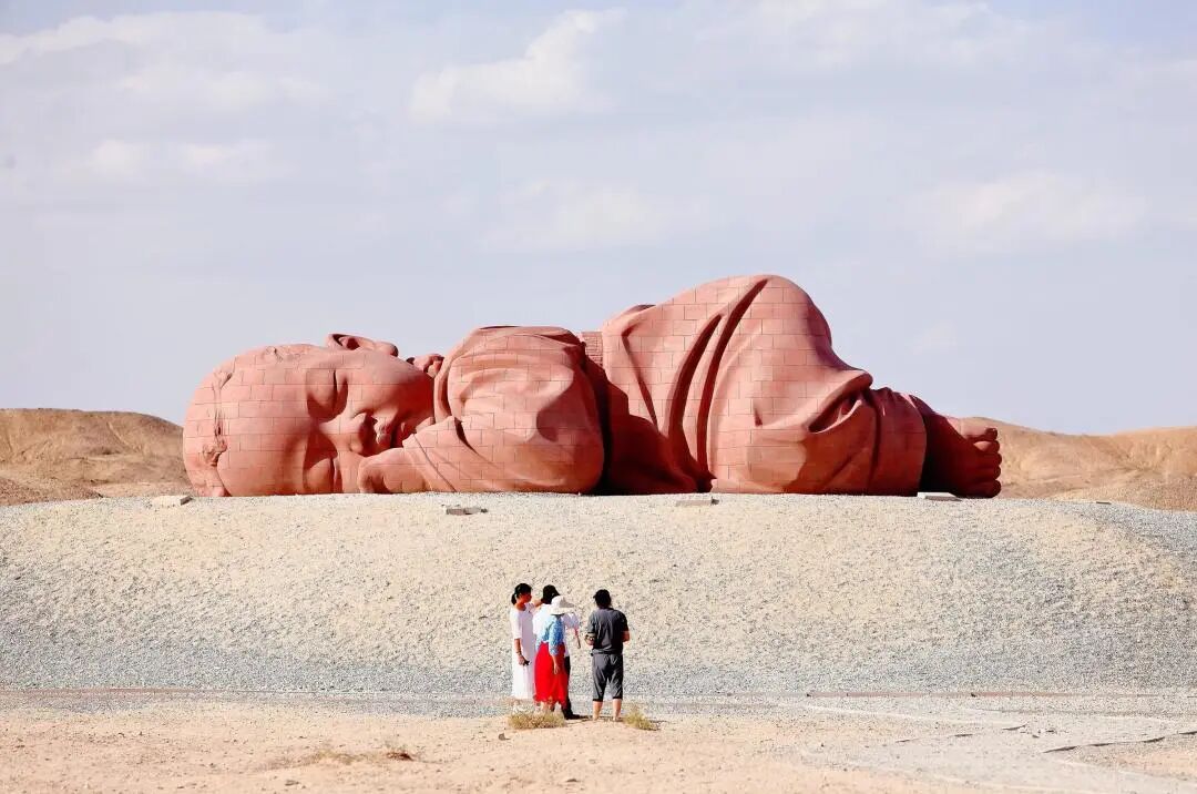 天为被,地为床,坐车经过瓜州县以南十公里的沙漠戈壁滩,穿越雕塑长廊,你会意外地发现,远处竟“趴着”一位体型庞大的“大地之子”。
