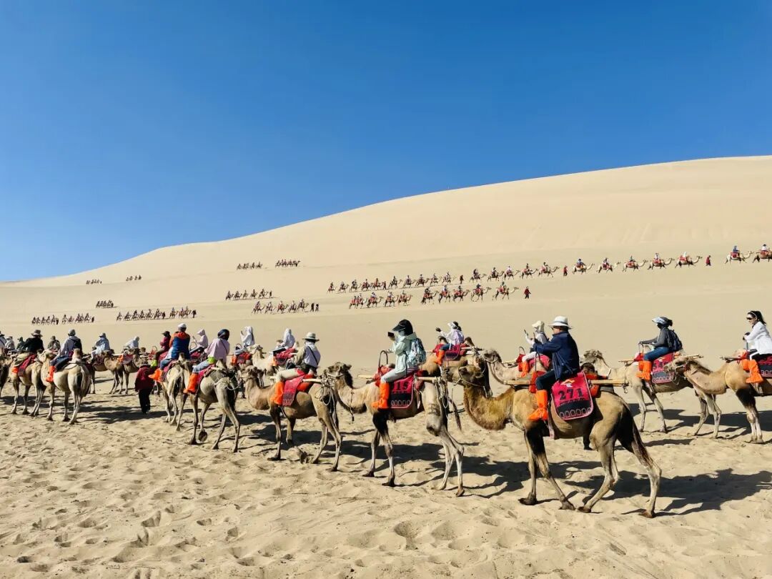 上午,我们前往月牙泉品尝当地特色美食,骑上骆驼,加入庞大的队伍,一起攀登“敦煌八景”之一的鸣沙山,过程中尽情饱览大漠风光。