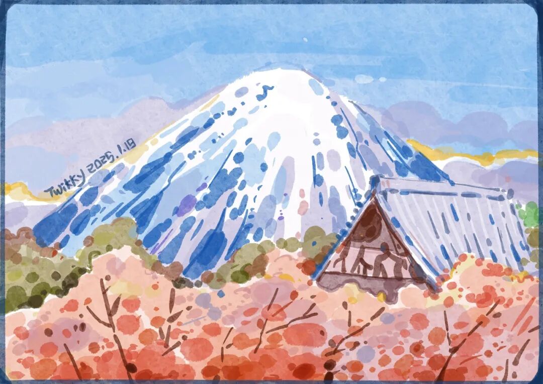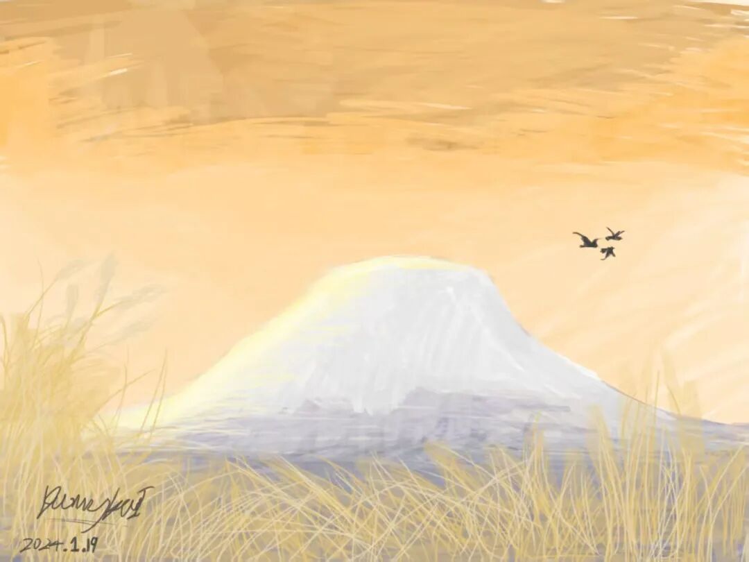 经过前面几天的练习,孩子们获得了一定的iPad艺术创作基础。这节课,孩子们将综合学习板绘的进阶操作,需要把光线设计、高斯模糊等特殊肌理效果运用到实景写生当中,完成一幅关于富士山冬日景观的板绘插画作品。