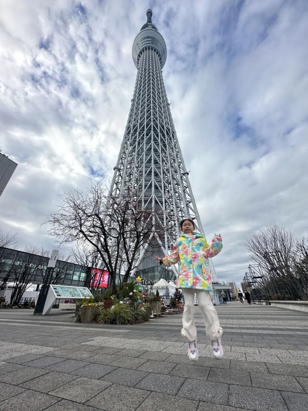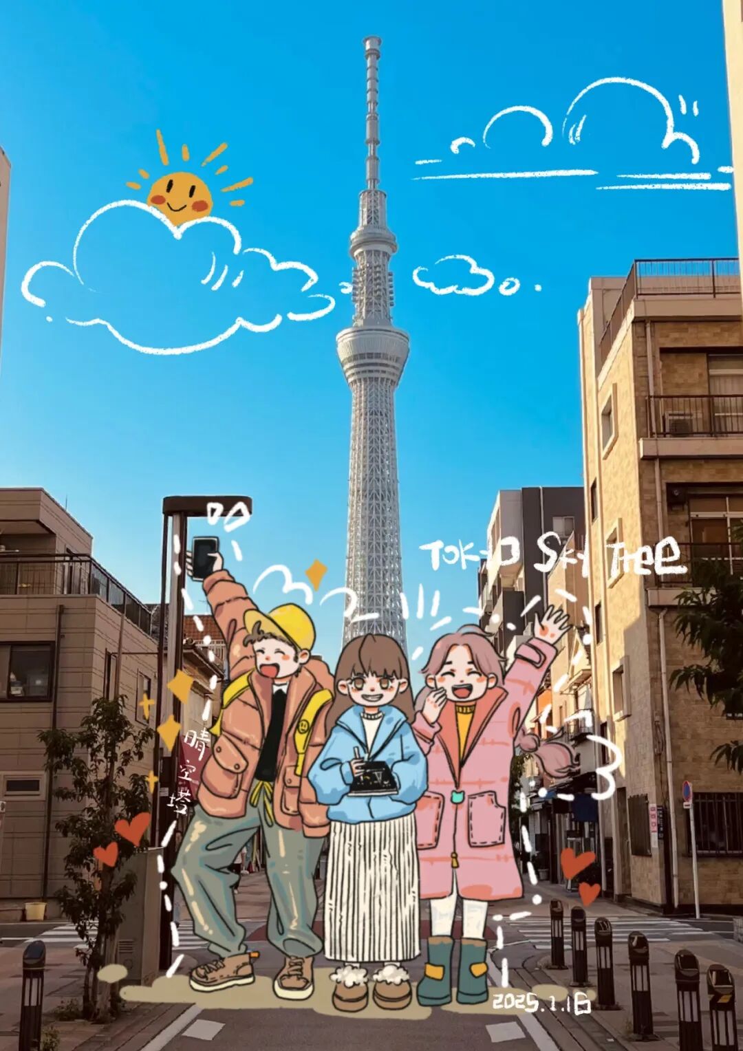晴空塔也是本次游学的重要课程主题。《晴空塔街头创作》课程,要求孩子拍摄3-4张带有晴空塔的街道照片,然后导入平板电脑,叠加图层进行创意拼贴,最后再根据画面内容进行加工,手绘涂鸦。