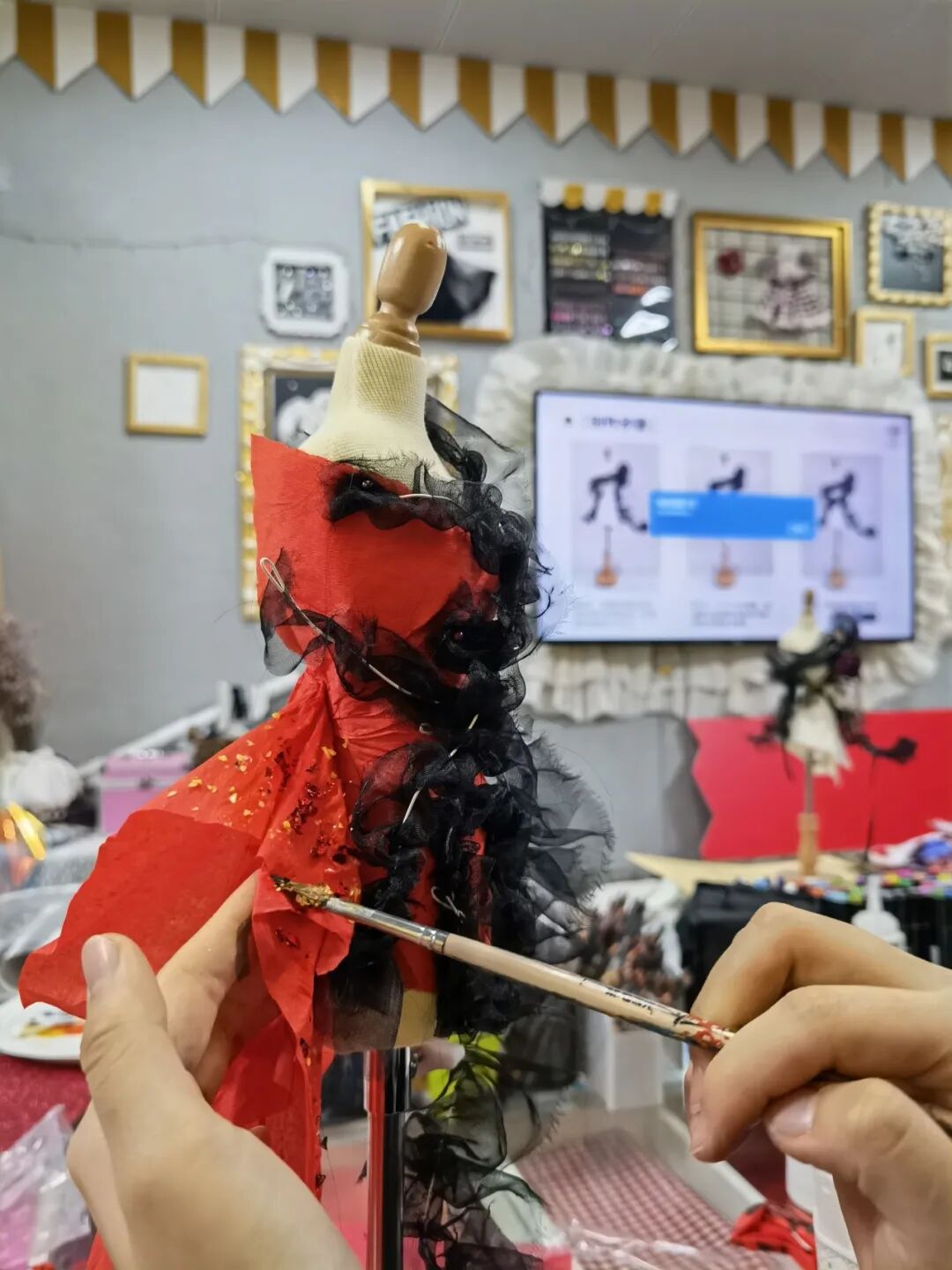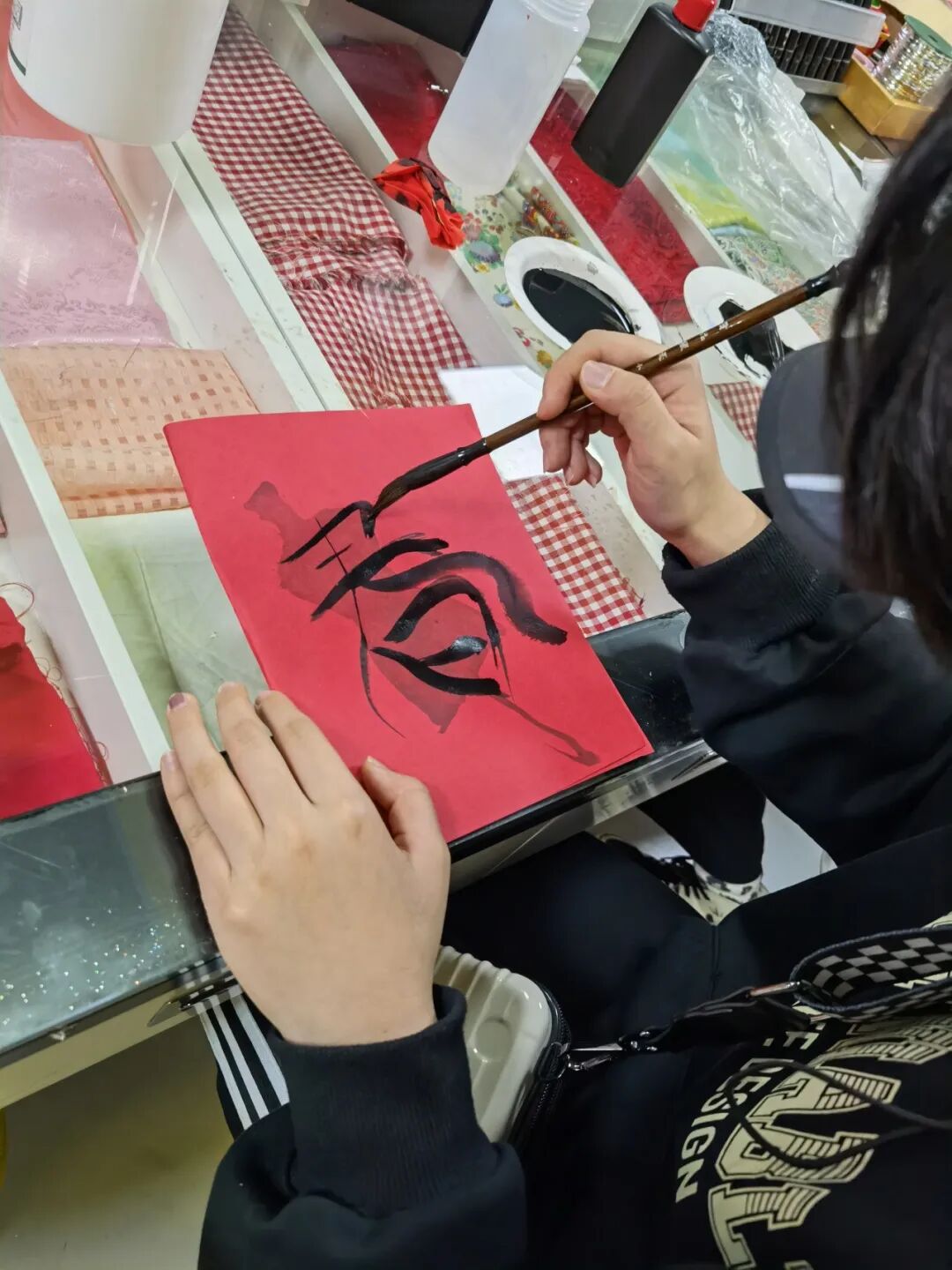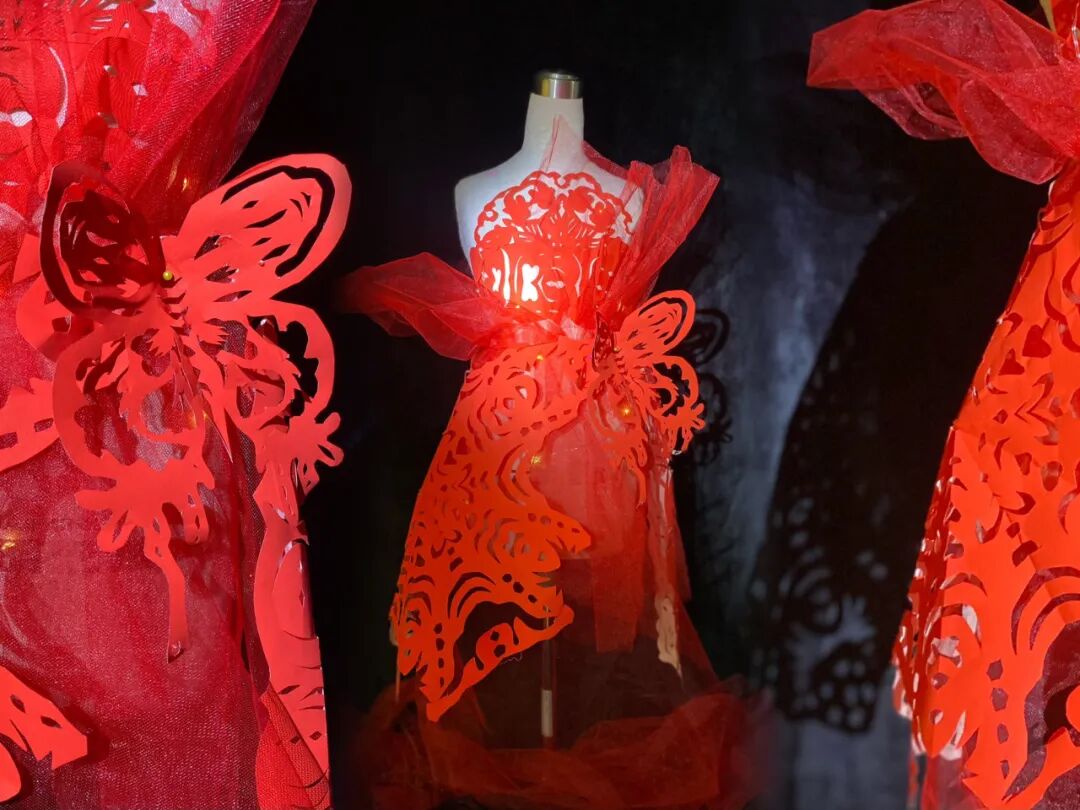 杨梅红小时装设计师们,通过学习欣赏不同书体的运笔方式及字体结构,将中国书法元素与服装设计相结合,运用立裁、缝纫等技法,完成服装设计。