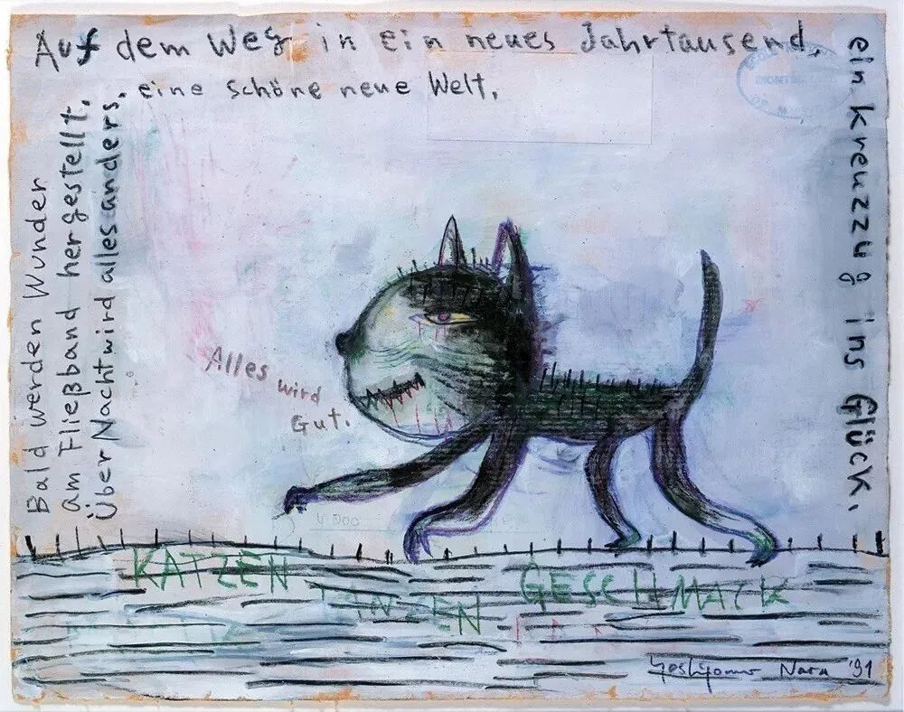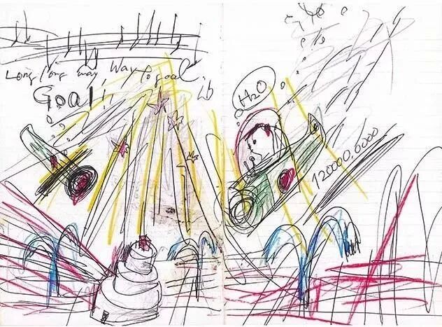 奈良美智涂鸦作品。著名当代艺术家奈良美智,他创作的可爱、叛逆的怪娃娃形象被世人熟知,画风具有明显的漫画感。实际上,奈良美智从小便喜欢涂鸦和漫画,6 岁时的他还给自己画了一本小小的绘本,名叫《企鹅物语》,他想象着和自己养的猫咪从北极去到南极,一起冒险。