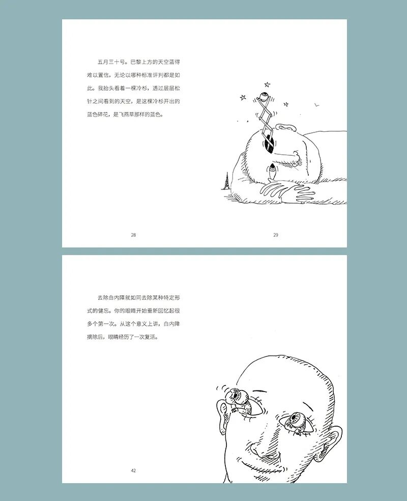 约翰·伯格与好朋友德米雷尔合作完成哲学绘本系列作品——《海滩上的一个男人》《白内障》《烟》《几点了》,德米雷尔用他想象力丰富、充满诙谐色彩的漫画,承载并表现了伯格讲述的故事的思想深度和密度。