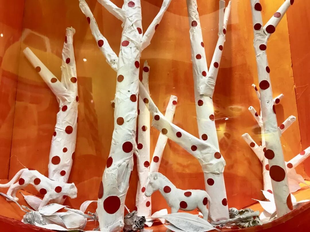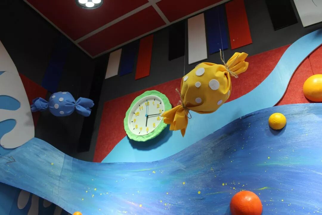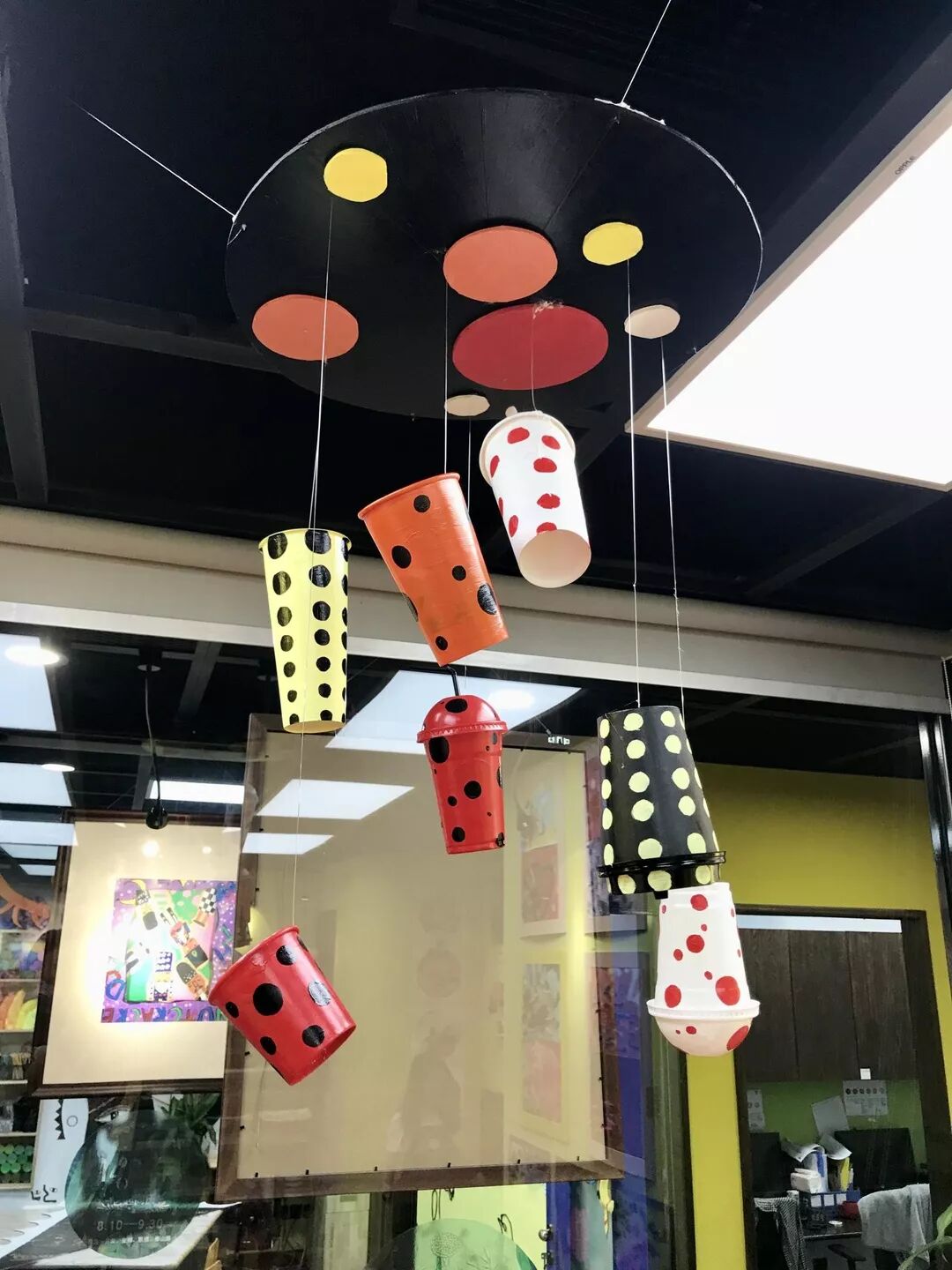 运用草间弥生的创作风格,以波点为元素,考虑米罗班的特点,整体色调以红、白、黄、为主,整个背景墙以四个不同造型的瓶子作为主体,两个红瓶子添加了一个大场景和五个小景,为整个装置增添趣味性,而教室出风口下悬挂了一串挂饰,兼顾装饰的同时也避免了风直吹孩子。