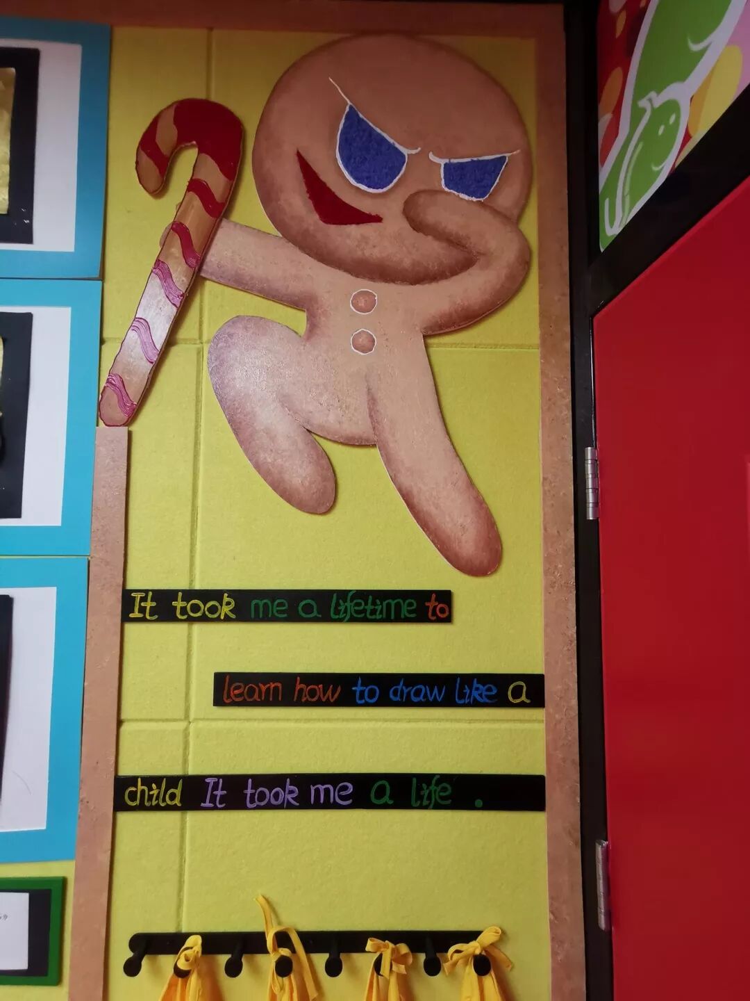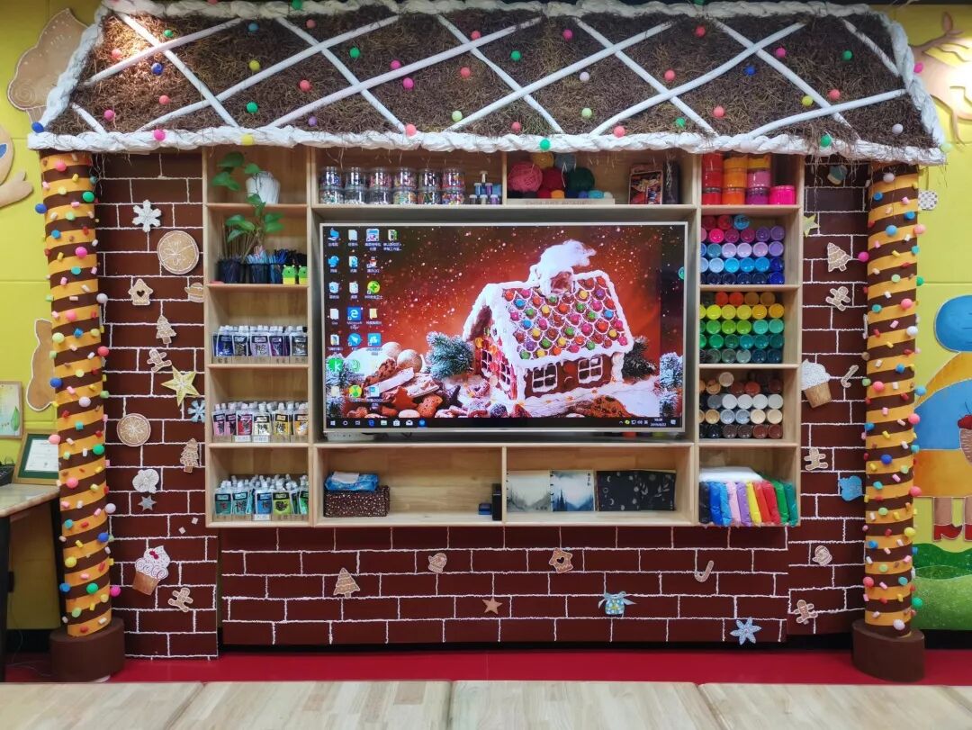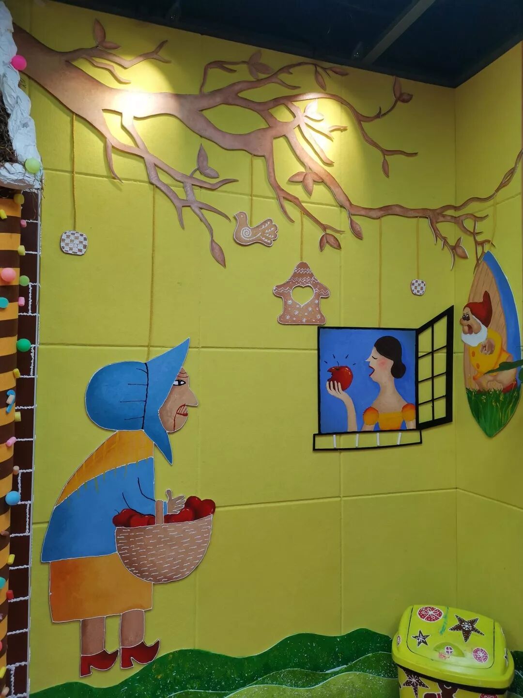 主色调以姜饼本来的颜色棕色为主,添加了很多彩色的糖果装饰,在认识不同颜色代表不同口味的同时,使的整个教室更加活泼。因为我们教室墙面比较多,在保证不沉闷、不杂乱的情况下,用三个姜饼超人连接整个主题,草坪的位置也是不同方向,最后主题墙加入了比较经典的童话故事嵌入,使整间教室更具有趣味性。
