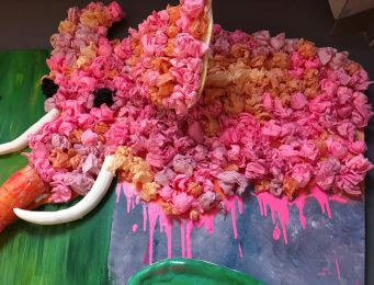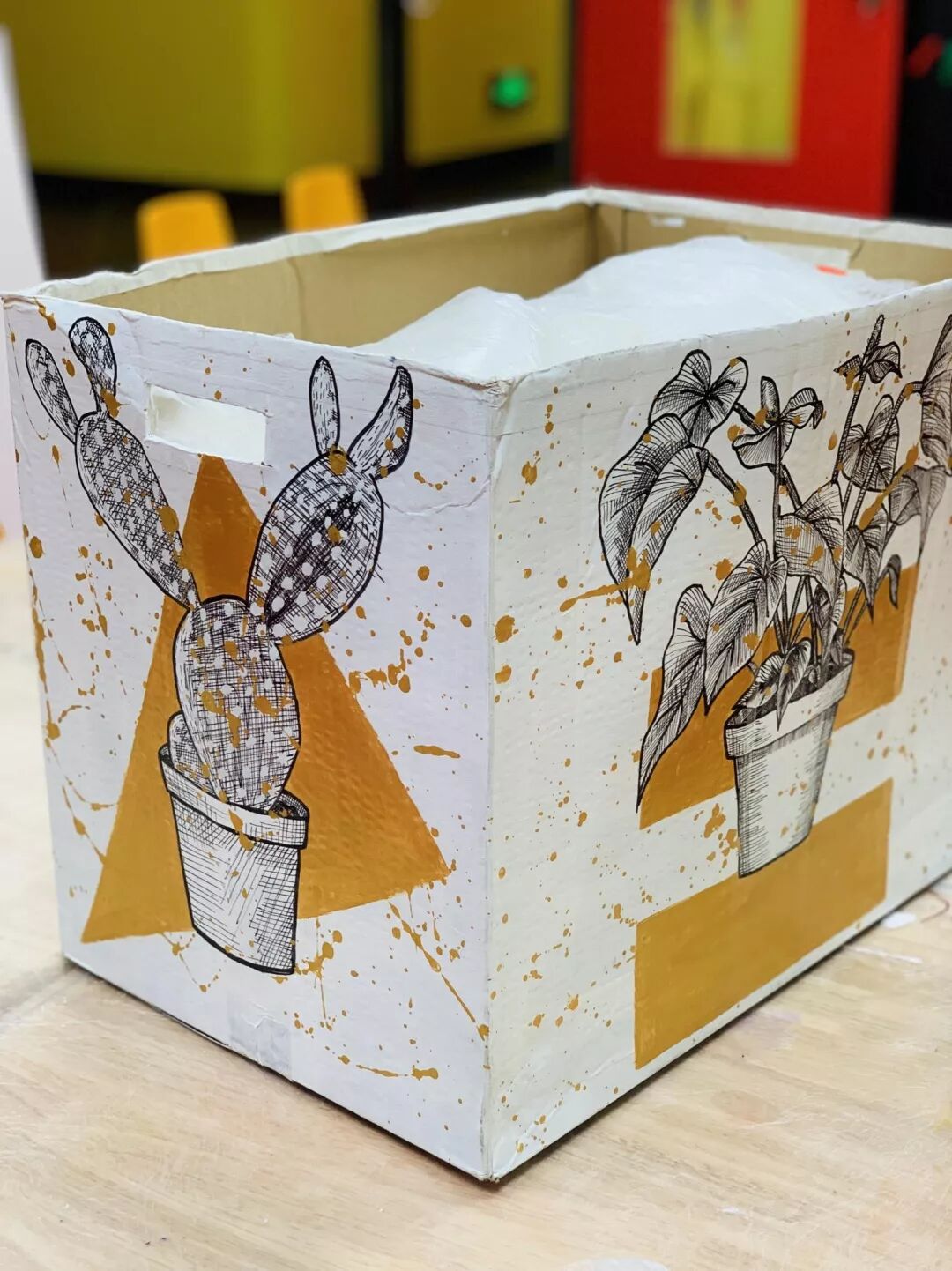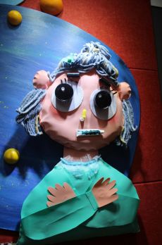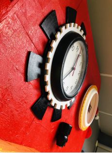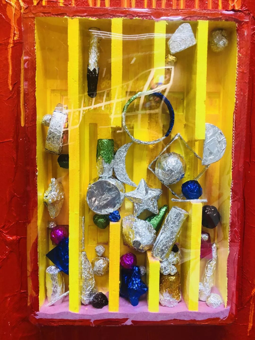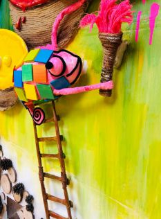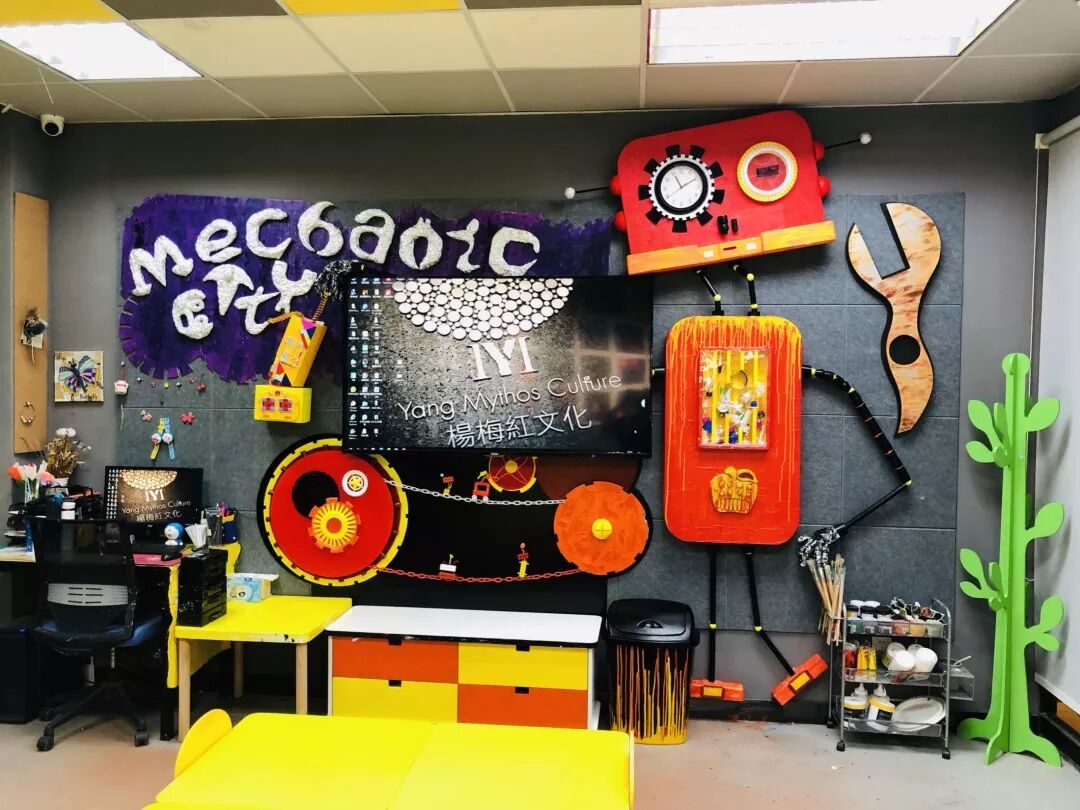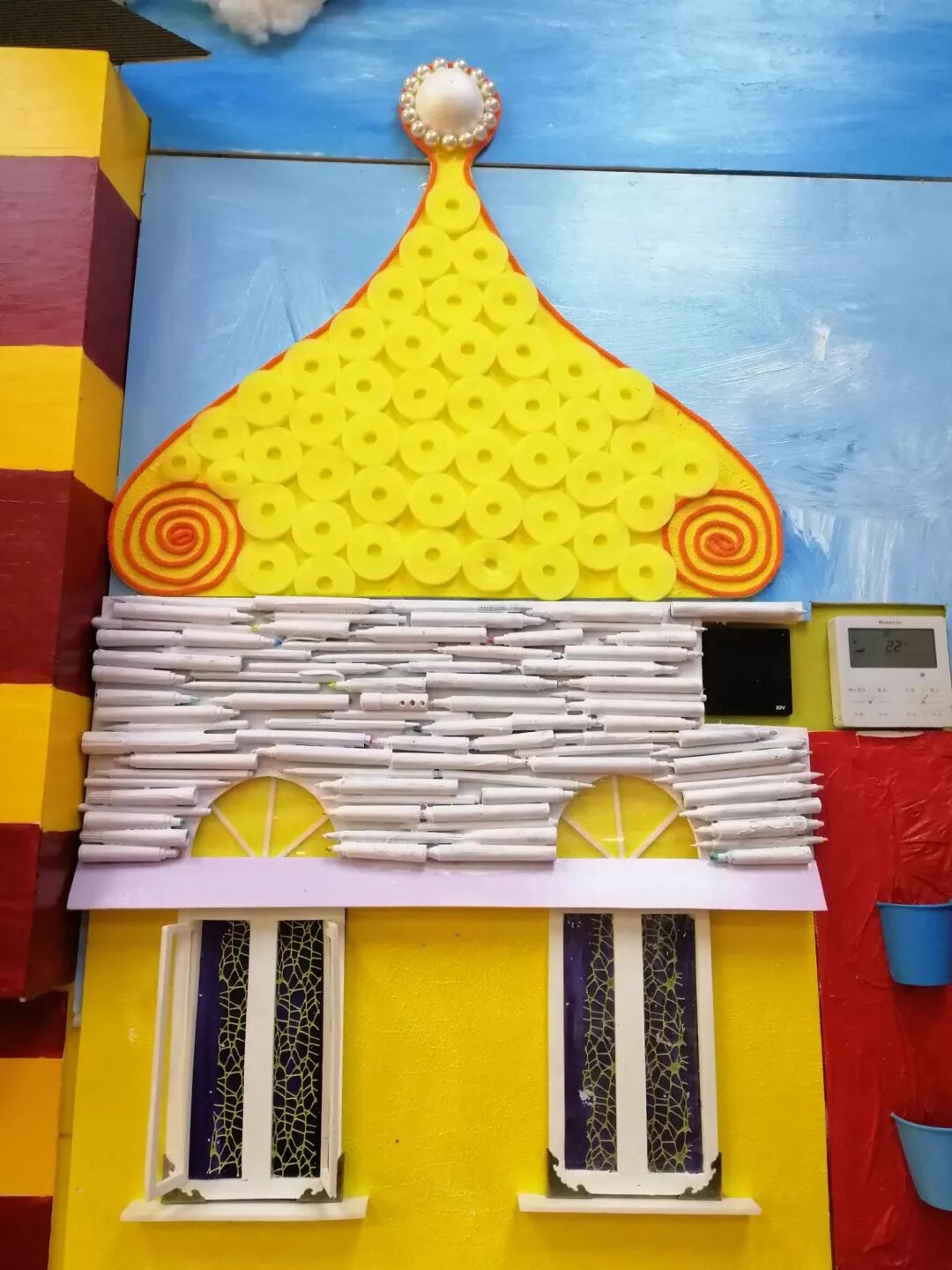 来源于未来机器城的电影,需要让孩子发现生活中的点滴,用废旧材料制作,机器有金属色所以用锡箔纸更加整体,暖色的红黄色系,给人热情的感觉,米罗的孩子在这样的环境中可以无拘无束的创作。