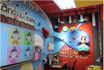 选择红色、黄色作为房子的主要色,蓝色的天空、紫色的条纹、绿色的草丛为辅色,黑色屋顶中和缓和了两者之间的关系,整体颜色搭配大胆,明亮的暖色会让人看起来就会心情变得比较好,造型简单、进入教室会被简单的物体造型深深印在脑海里,使人印象深刻。天空上的英文字母意思是:“勇敢是成功的一半。”鼓励米罗年龄段的小朋友要勇敢脱离爸爸妈妈能够独立上课、能够勇敢尝试新的颜色、并能够勇敢用自己选择的颜色去涂画出自己想描绘的东西和事物