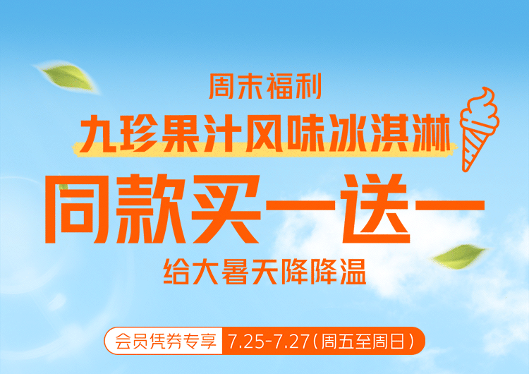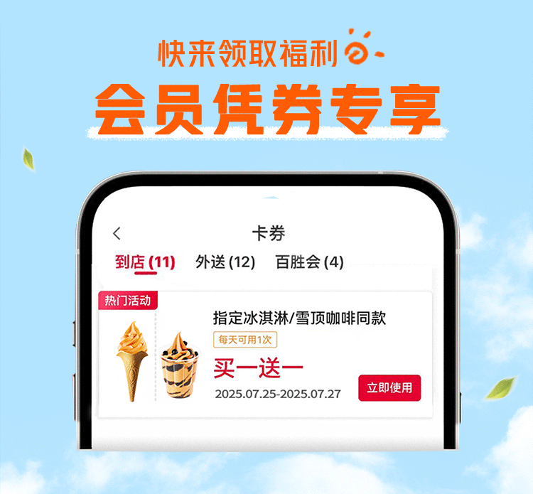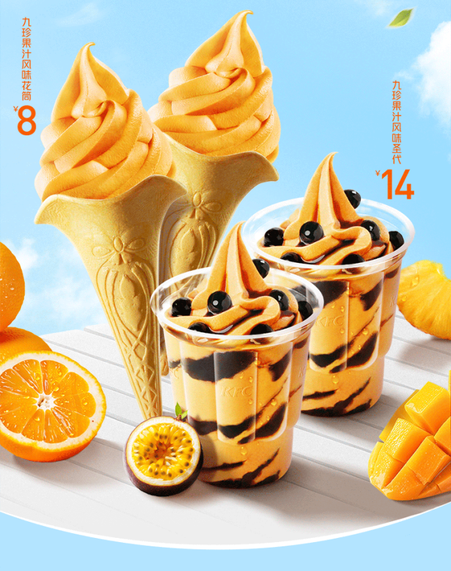 活动自2025年7月18日至2025年7月20日和2025年7月25日至2025年7月27日。活动期间,肯德基WOW会员可在“我的卡包”查看到店专享“指定冰淇淋/雪顶咖啡同款买一送一(堂食可选产品:九珍果汁风味花筒(单旋)、九珍果汁风味圣代(单旋)、现磨牛奶雪顶咖啡、牛奶雪顶抹茶拿铁、九珍果汁风味雪顶咖啡;肯德基甜品站&K咖啡速取窗可选产品:九珍果汁风味花筒(单旋)、九珍果汁风味圣代(单旋)、九珍果汁风味K飓风;肯悦可选产品:现磨牛奶雪顶咖啡、牛奶雪顶抹茶拿铁、九珍果汁风味雪顶咖啡)”、外送专享“指定冰淇淋同款买一送一(肯德基宅急送可选产品:九珍果汁风味圣代(单旋))”。活动地区:全国。活动渠道:【堂食-柜台点餐/堂食-自助点餐机/堂食-自助点餐到店自取/肯德基甜品站/K咖啡速取窗/肯悦/肯德基宅急送】。电子优惠券具体使用规则详见“我的卡包”券说明。同一会员就本活动电子优惠券每张仅限领取1次,每单仅限使用1张电子优惠券。同一ID、同一设备、同一手机号、同一支付账户、同一取餐联系电话、同一送餐联系电话、同一送餐地址,均视为同一用户。对于任何通过不正当手段(包括但不限于作弊、通过机器行为等方式恶意刷单)参加活动获取权益或者不符合活动规则的行为,我们将在不事先通知的前提下取消该用户参与活动的资格和已获得的相应权益。活动期间,会员凭到店专享优惠券自助点餐到店自取或凭外送专享优惠券在肯德基宅急送订餐,以菜单单品价购买指定产品1份,即可得同款产品1份。如遇九珍果汁风味圣代(单旋)售罄,肯德基宅急送渠道凭券可替换为原味圣代(黑糖珍珠酱)。九珍果汁风味冰淇淋系列产品自2025年7月5日在全国范围内陆续上市,九珍果汁风味花筒全国限量230万个,九珍果汁风味圣代全国限量100万个,九珍果汁风味K飓风全国限量9万个,九珍果汁风味雪顶咖啡全国限量45万个,售完即止。堂食具体供应时间以餐厅实际营业时间为准,仅限有此产品供应的部分肯德基餐厅,交通枢纽、旅游景区、西藏自治区的餐厅及精选餐厅等部分餐厅除外,具体情况以餐厅餐牌公示为准。外送部分送餐区域不供应此产品,详情以输入地址后显示的菜单及送餐时间为准。外送费及打包服务费需自理。甜品站具体供应时间以甜品站实际营业时间为准,仅限有此产品供应的部分肯德基甜品站,交通枢纽、旅游景区的餐厅及精选餐厅等部分餐厅的甜品站除外,具体情况以甜品站公示为准。除推广产品外,其他物品仅做装饰目的,图示内容仅供参考。产品、周边、玩具及包装以实物为准。不与其他优惠共享。堂食、肯德基宅急送自有渠道、第三方外卖平台外送渠道、甜品站、团购渠道、企业送渠道及其他渠道的产品组合、价格及优惠活动,以各渠道页面公示为准。