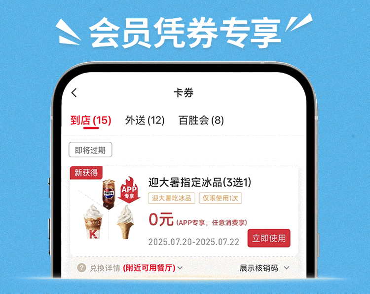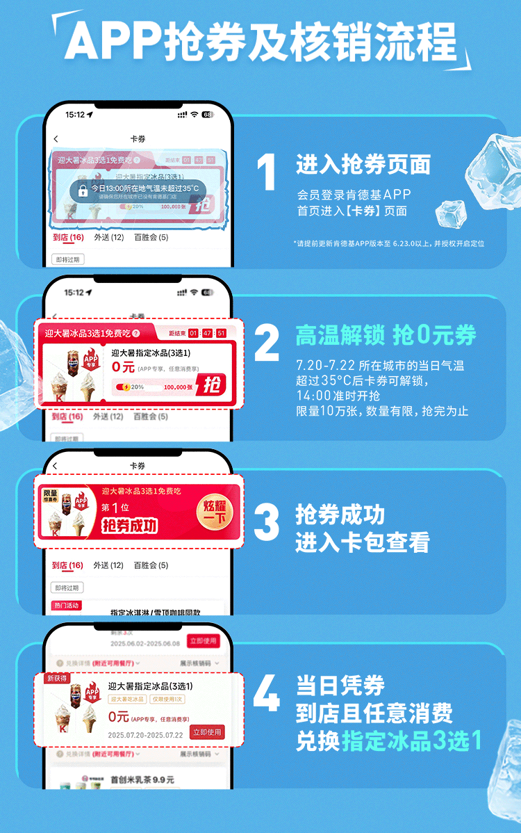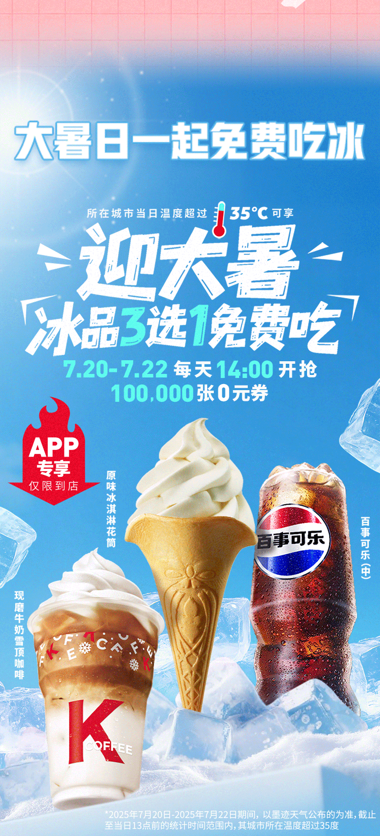 2025年7月20日至2025年7月22日期间,以墨迹天气公布为准。截止至当日13点前的统计时间范围内,其城市所在的温度超过35度,则于当日14点起,用户前往肯德基超级APP登录肯德基WOW会员后,可通过【APP卡包】领取【迎大暑指定冰品3选1】0元券1张(任意消费享)。指定3种冰品选1种:现磨牛奶雪顶咖啡、原味冰淇淋花筒、百事可乐(中)。每天全国限量100000张,发完即止,请前往肯德基超级APP会员卡包查看并仅限到店使用。当日凭券到店任意消费后0元核销,仅限当日使用,逾期失效。活动范围:仅限肯德基超级APP。APP会员专享活动地区:全国。电子优惠券的具体使用规则详见“我的卡包”券说明。同一会员就本活动电子优惠券每张仅限领取1次,每单仅限使用1张电子优惠券。同一ID、同一设备、同一手机号、同一支付账户、同一取餐联系电话、同一送餐联系电话、同一送餐地址,均视为同一用户。对于任何通过不正当手段(包括但不限于作弊、通过机器行为等方式恶意刷单)参加活动获取权益或者不符合活动规则的行为,我们将在不事先通知的前提下取消该用户参与活动的资格和已获得的相应权益。堂食具体供应时间以餐厅实际营业时间为准,仅限有此产品供应的部分肯德基餐厅,交通枢纽、旅游景区、西藏自治区的餐厅及精选餐厅等部分餐厅除外,具体情况以餐厅餐牌公示为准。除推广产品外,其他物品仅做装饰目的,图示内容仅供参考。产品、周边、玩具及包装以实物为准。不与其他优惠共享。堂食、肯德基宅急送自有渠道、第三方外卖平台外送渠道、甜品站、团购渠道、企业送渠道及其他渠道的产品组合、价格及优惠活动,以各渠道页面公示为准。