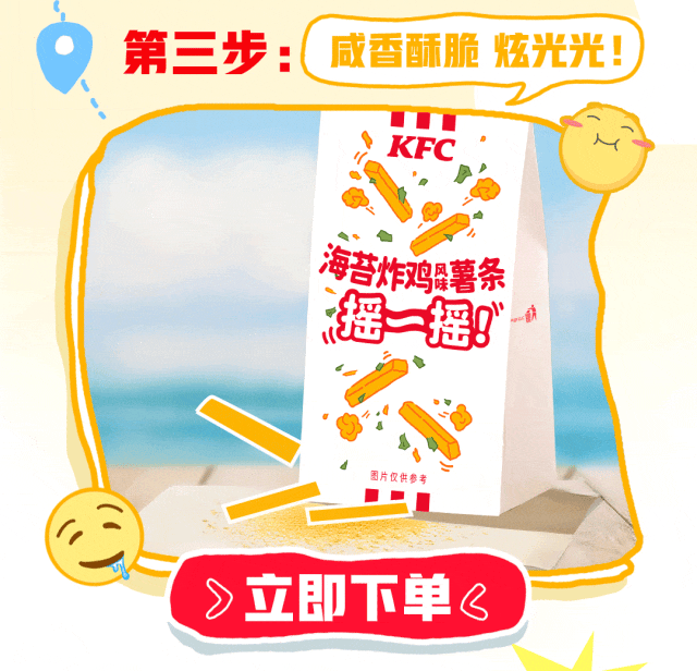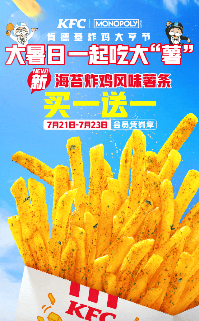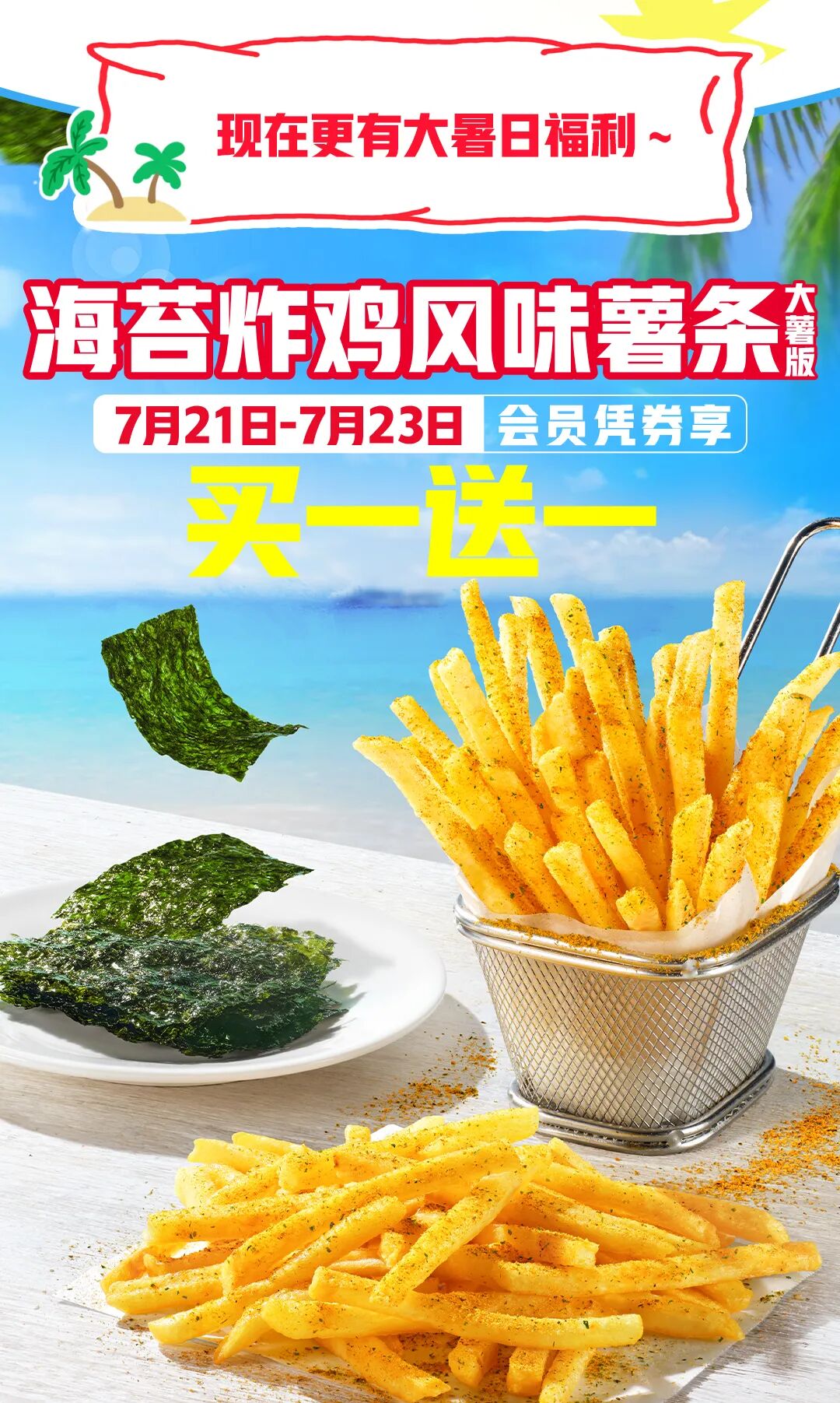 海苔炸鸡风味薯条自2025年7月21日起上市,共限量180万份,售完即止。活动渠道:堂食-柜台点餐、堂食-自助点餐机、堂食-自助点餐到店自取、外送-肯德基超级APP外送到家、外送-肯德基+微信小程序、外送-肯德基支付宝小程序。活动时间:9:30-23:00。活动地区:全国。堂食具体供应时间以餐厅实际营业时间为准,仅限有此产品供应的部分肯德基餐厅,交通枢纽、旅游景区、西藏自治区的餐厅及精选餐厅等部分餐厅除外,具体情况以餐厅餐牌公示为准;外送部分送餐区域不供应此产品,详情以输入地址后显示的菜单及送餐时间为准。外送费及打包服务费需自理。除推广产品外,其他物品仅做装饰目的,图示内容仅供参考。产品、周边、玩具及包装以实物为准。