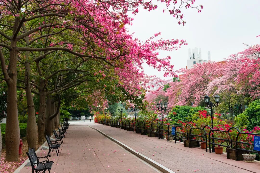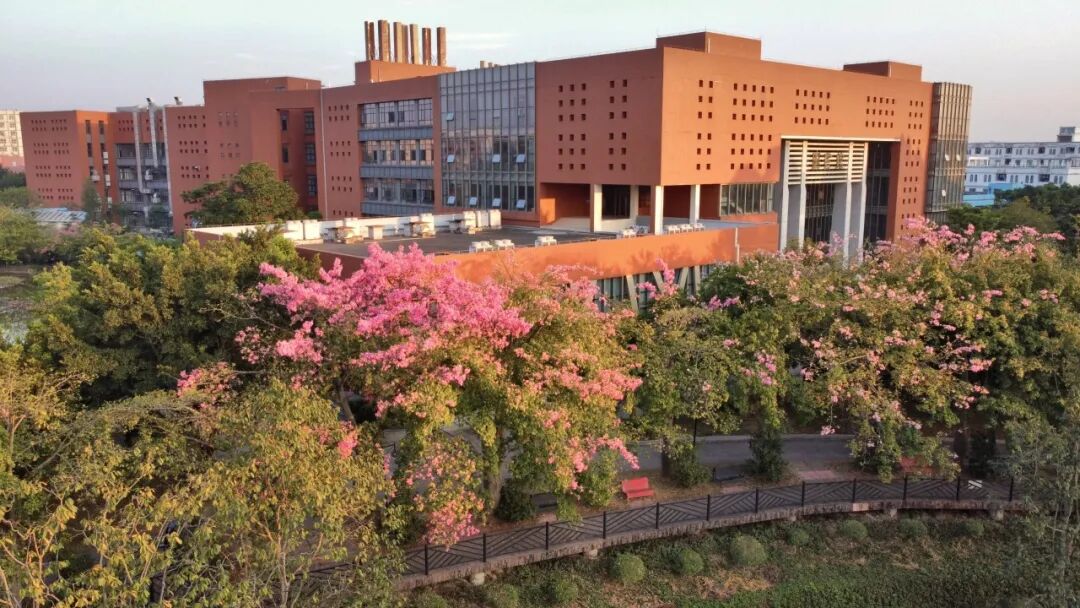 广软“校花”丝木棉在江门校区更是放开了性子,枝桠使劲往道路的中央伸。紫薇粉紫的花团堆在枝头上,花瓣落下来,和地面的光影缠成一团。走在楼下,总觉得下一秒就会有花瓣飘进衣领,像自然递来的一张俏皮请柬。