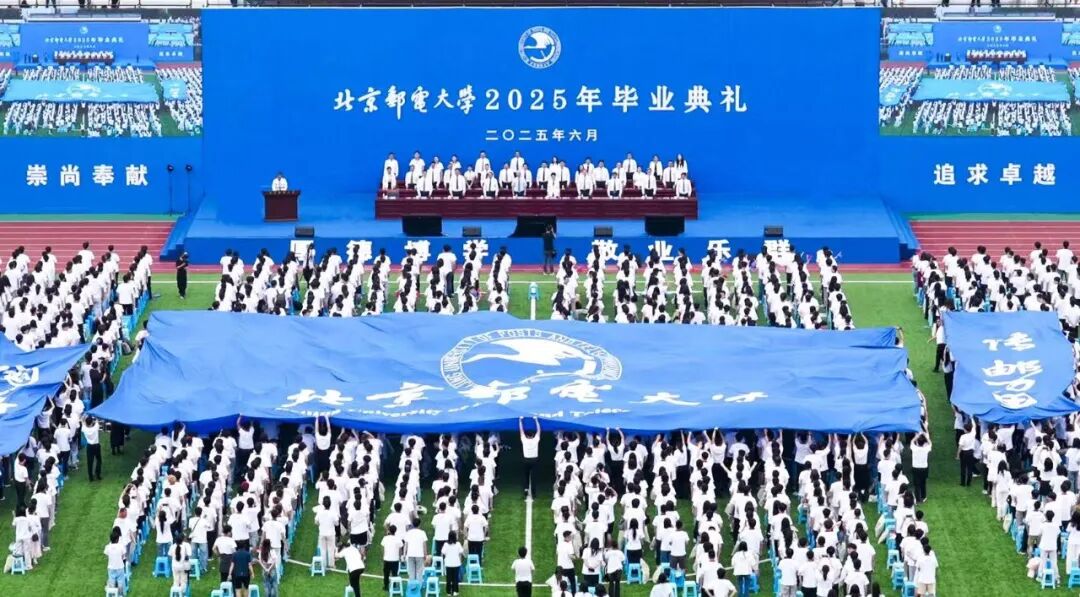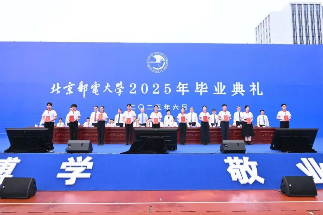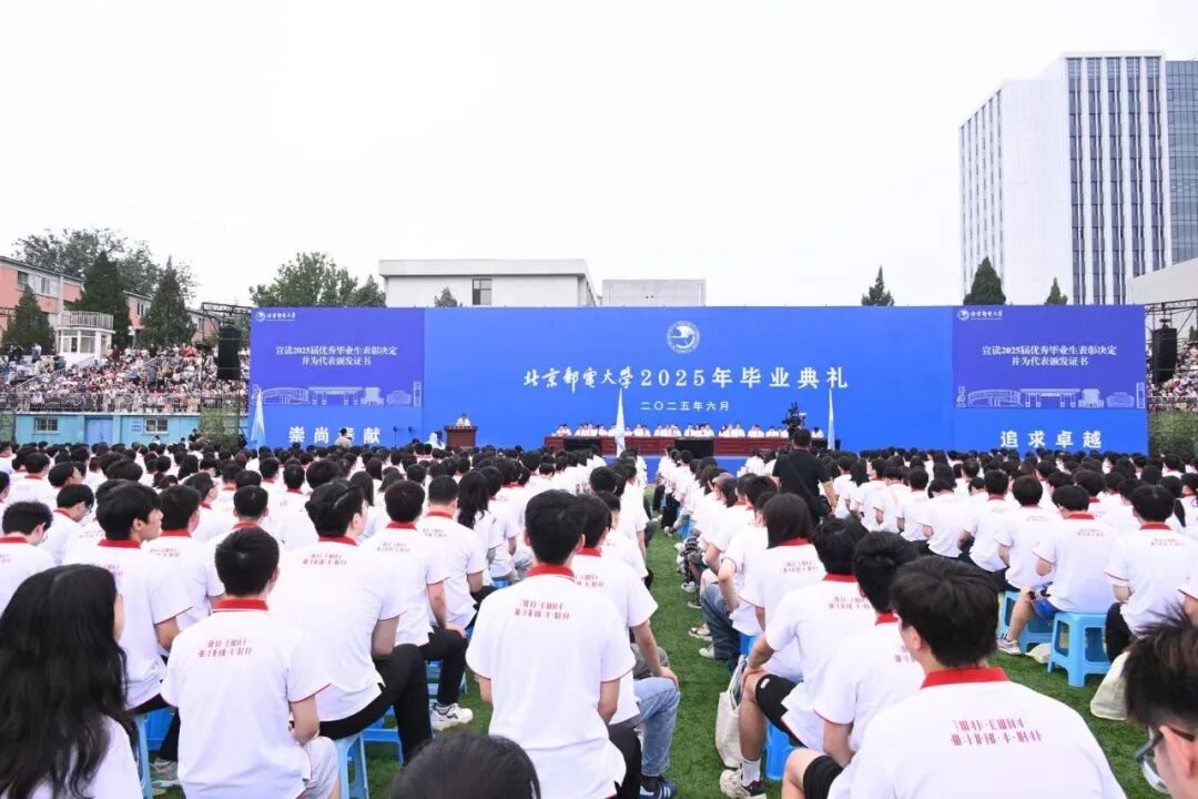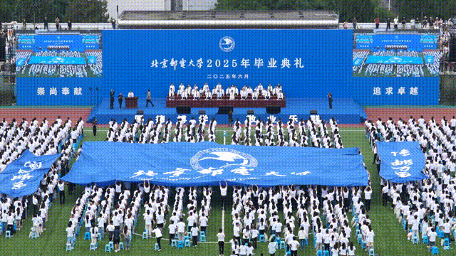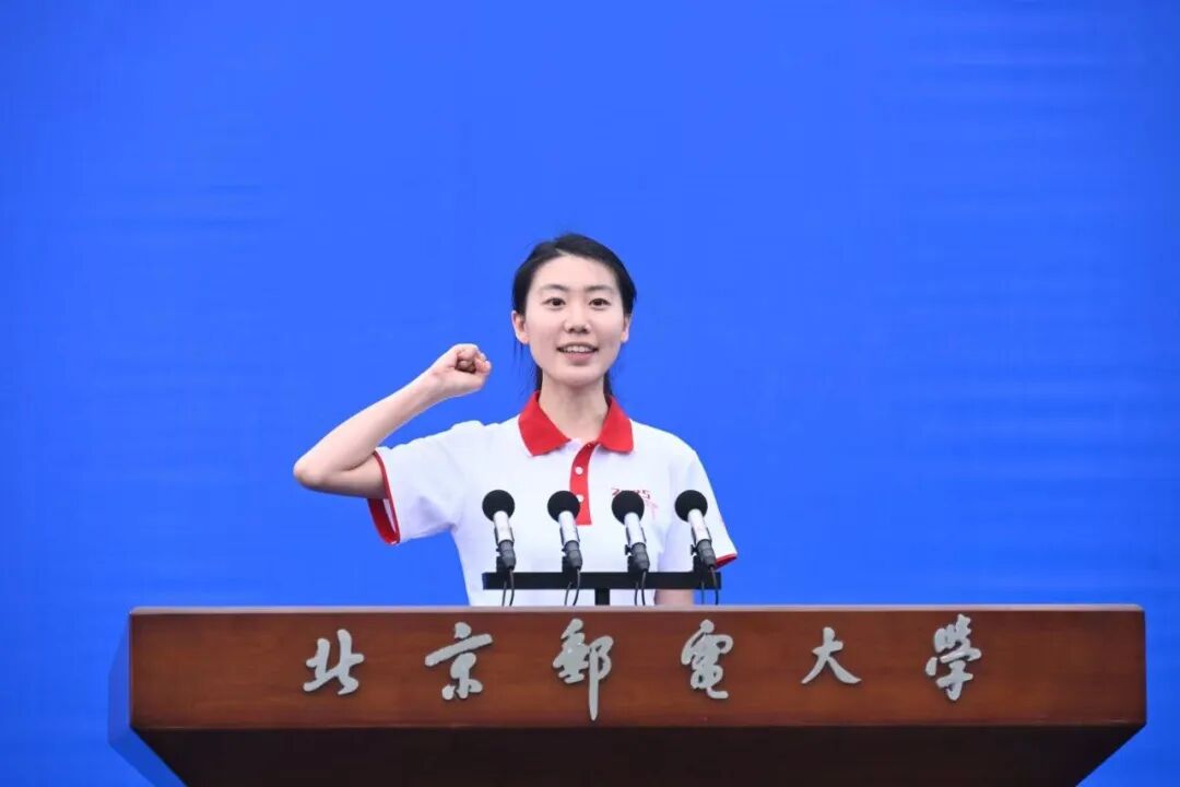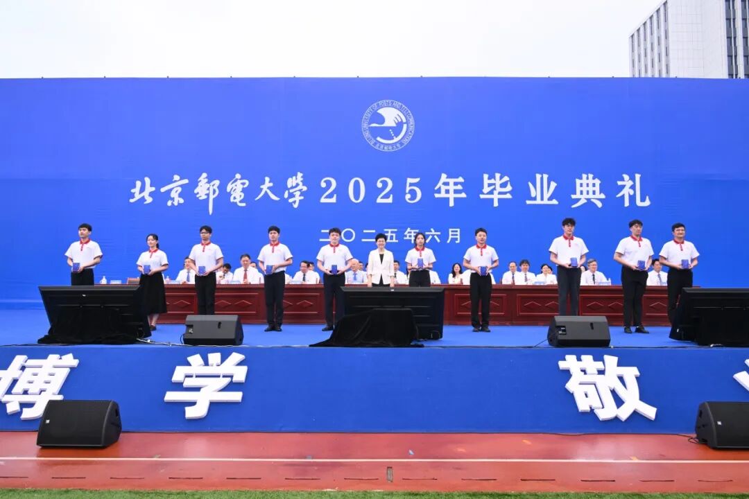 在毕业生代表、数学科学学院本科生刘羽齐的领誓下,全体毕业生用高亢嘹亮的声音立下了“牢记厚德博学,恪守敬业乐群;坚定网络强国,矢志网信报国;承继传邮万里,投身国脉所系;不忘母校教诲,勇担时代重任。以奉献之我,以卓越之我,以青春之我,为强国建设、民族复兴贡献力量,为中国式现代化挺膺担当!”的青春誓言。