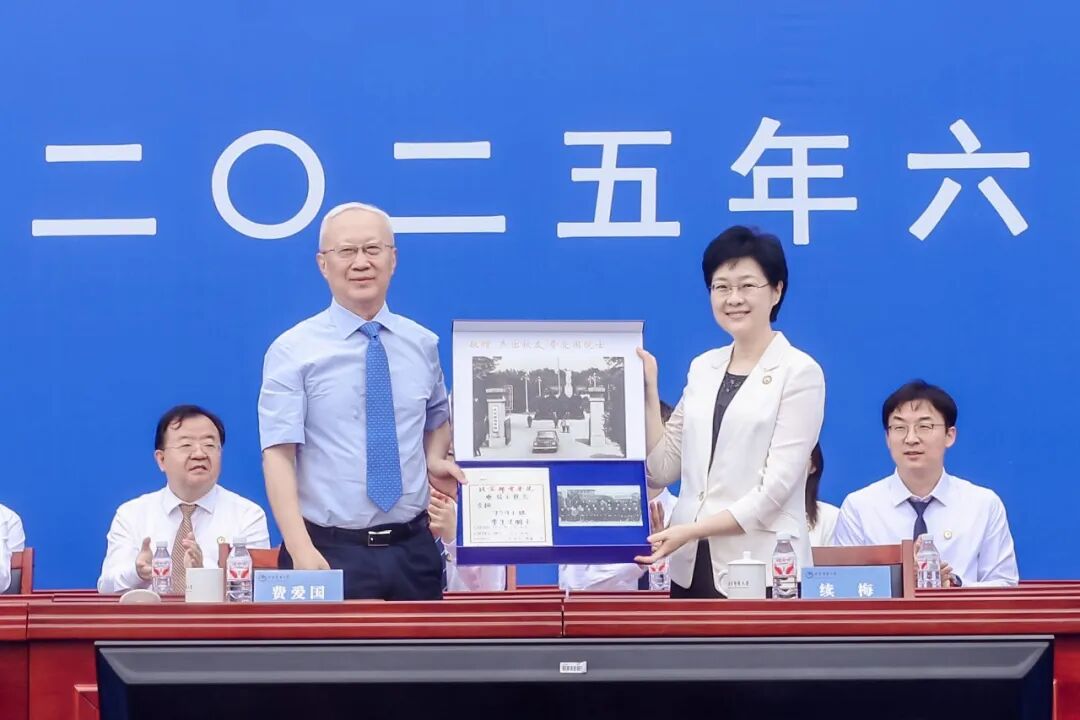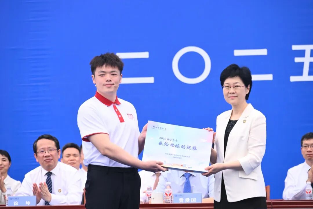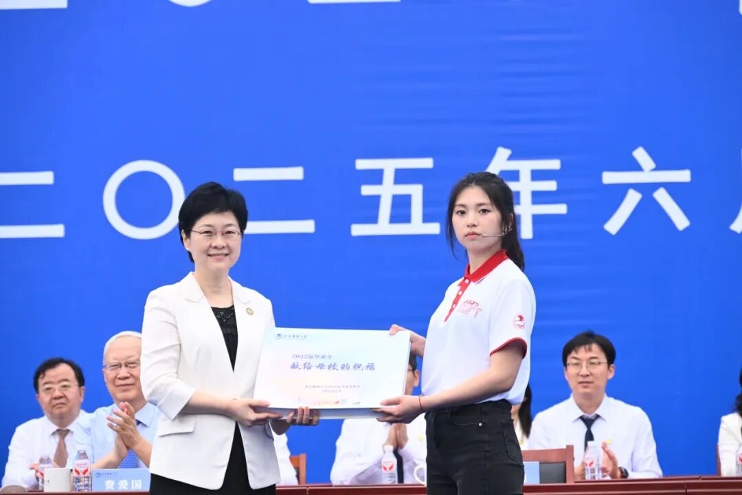 毕业生代表向母校深情告白,续梅向毕业生代表赠送专属纪念礼物,并代表学校接受了本科毕业生左偲彤、研究生毕业生陈晟远代表全体毕业生赠送的《毕业纪念册》。《毕业纪念册》将在学校档案馆内永久珍藏。