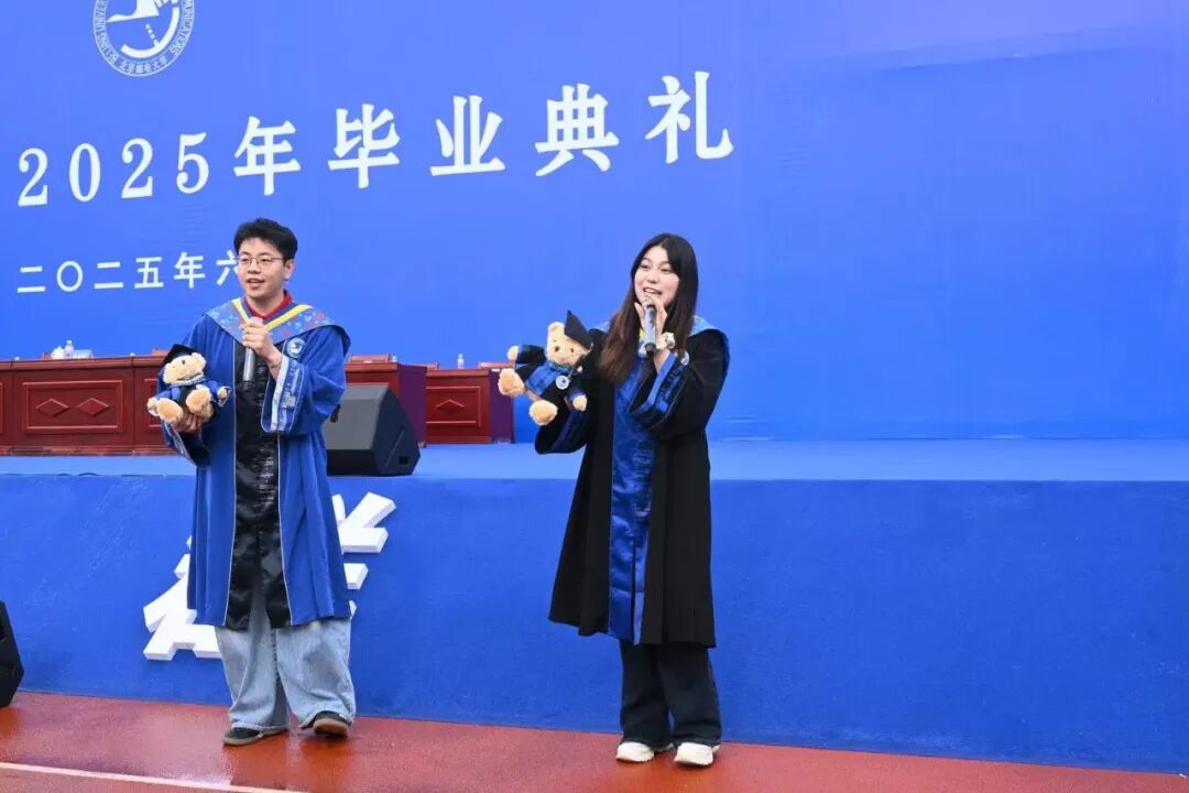 教职工代表为全体毕业生送上毕业祝福,毕业生代表用鲜花向他们表达深深的感谢与敬意。