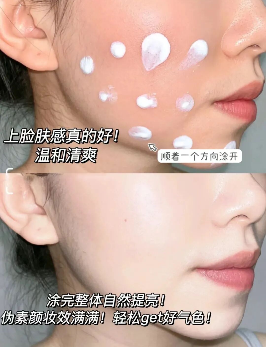 一瓶=妆前乳+隔离霜+保湿霜,相当于买了1瓶素颜霜,可以得到3种不同的护肤品!比起平常粉底液类的妆效产品,用法也更简单,面霜怎么涂的,这素颜霜也这么涂。如果想要更服帖,涂上脸后可以借助美妆蛋拍拍。如果想要更自然好看,推荐大家用素颜霜涂全脸后,再补个眉毛和口红。这样,精致感、气色会更好,肉眼看就像画了个淡妆一样,妥妥拯救咱打工人暗沉蜡黄的面色,还能让你早上多睡会!上班懒得化妆又想气色好,用它也能轻松营造自带柔光的伪素颜。