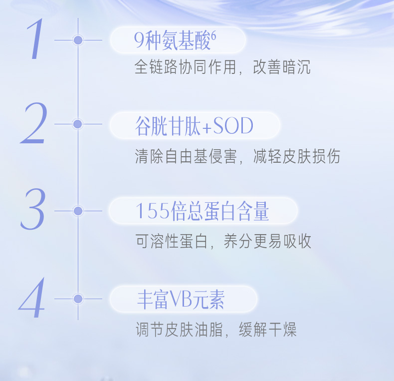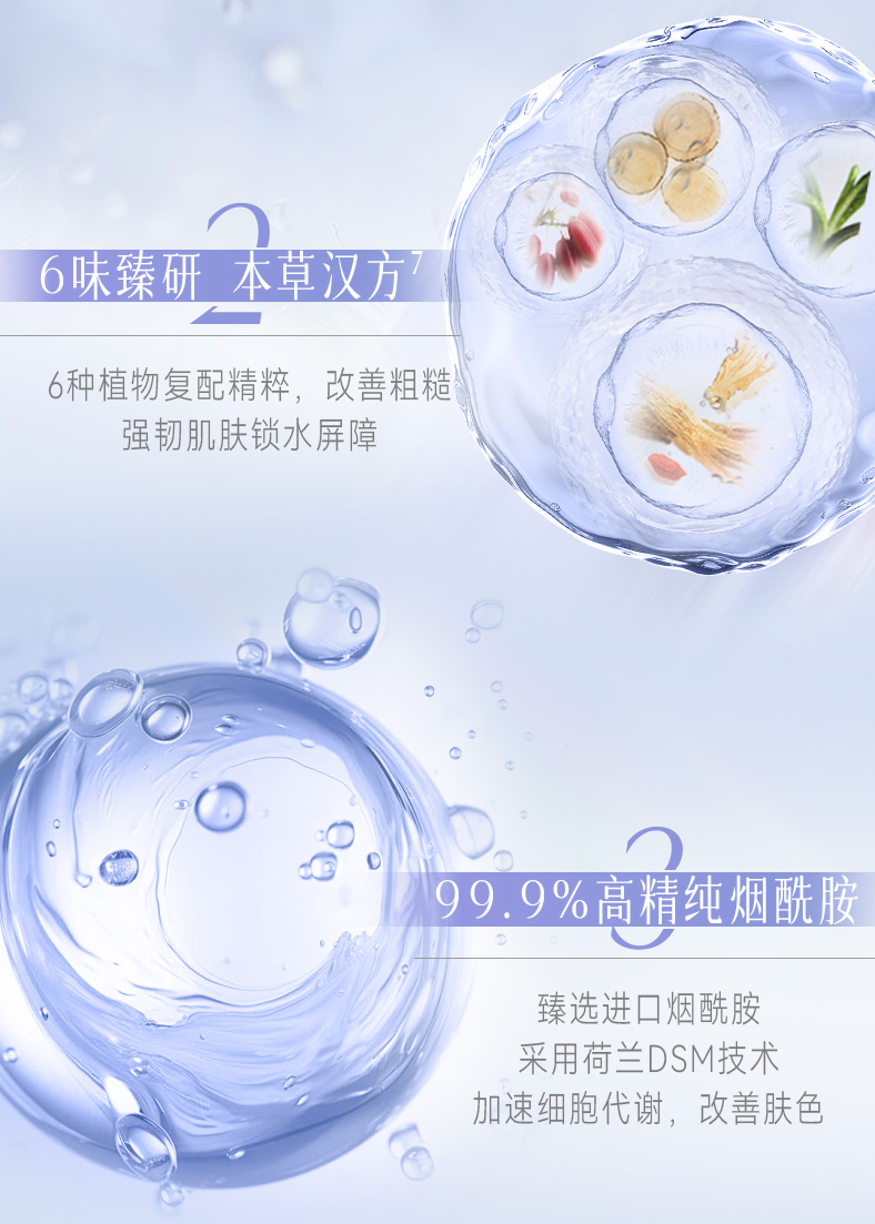 添加荷兰皇家DSM原料集团研发的99.8%高纯度烟酰胺!让肌肤更耐受,有效促进皮肤新陈代谢,改善暗沉。