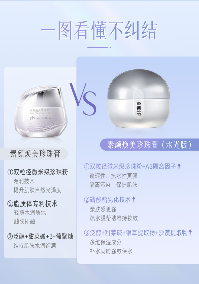 早八人,真的太难了吧!就没有什么懒人神器,可以不用早起、不化妆,也能轻松拥有好气色的呢?那就不得不推荐这款京润珍珠新上市的——素颜焕美珍珠膏(水光版)一上脸,提亮肤色,让暗沉偏黄的肤色,变成自带柔光的冷白色。就像涂面霜一样方便快捷,分分钟拯救手残党、懒人党!新升级的素颜霜,不仅可以遮住微小瑕疵、提亮肤色,还能保湿脸蛋,深入肌底养护肌肤。- 配方新增AS隔离因子,不仅可以遮瑕,还能隔离灰尘彩妆,保护肌肤。