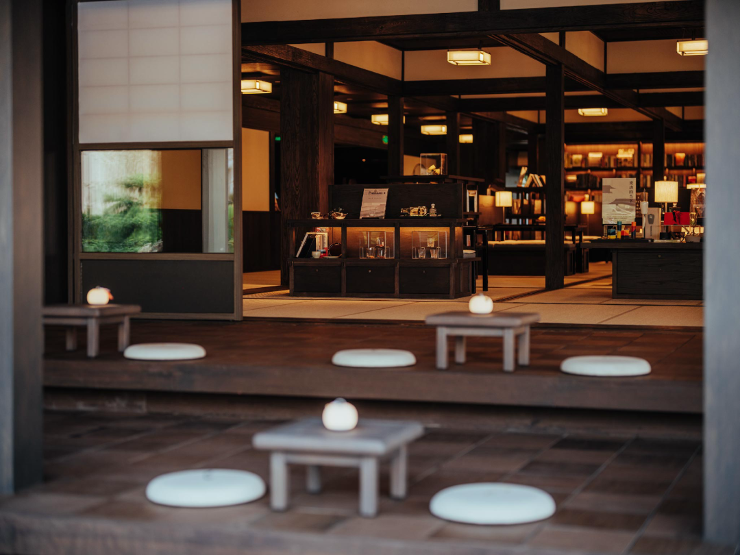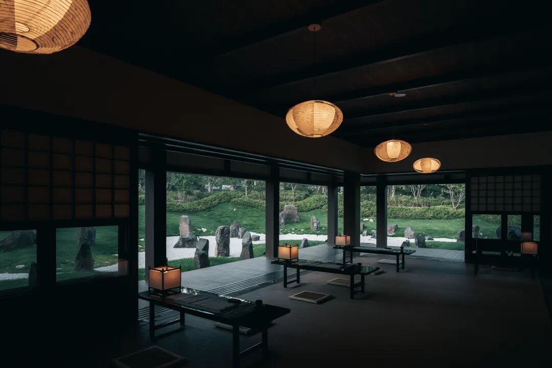 步入庭园,白沙、绿苔与景石的传统造法,融合在地的松、樱,枫等树种,浓缩成绚烂的四时之景。形状变幻的窗,与朦胧的雪见障子组合,从不同角度选择庭园的最佳画面。倘若在雨天和飘雪天造访,会感到别样的禅意。