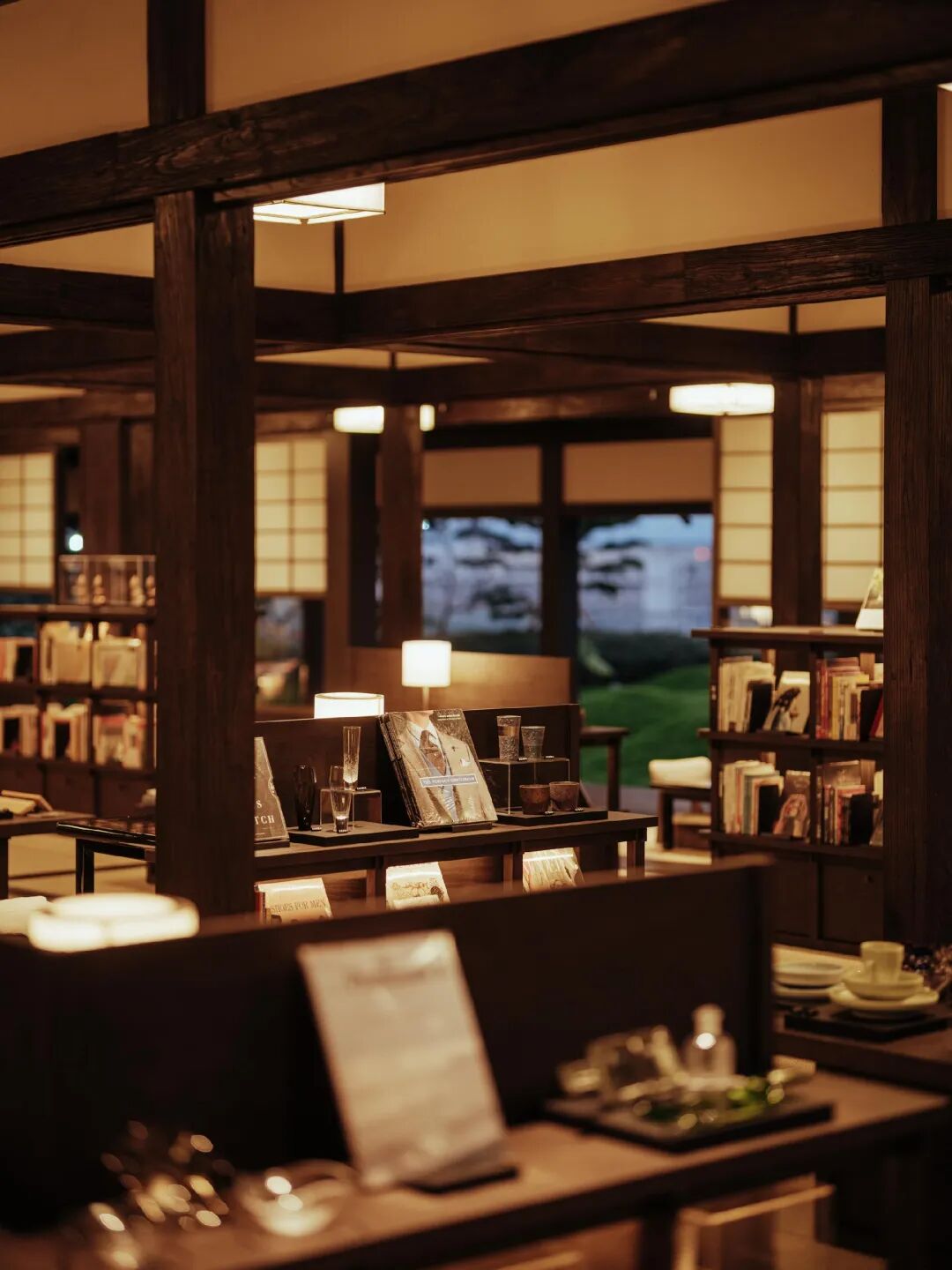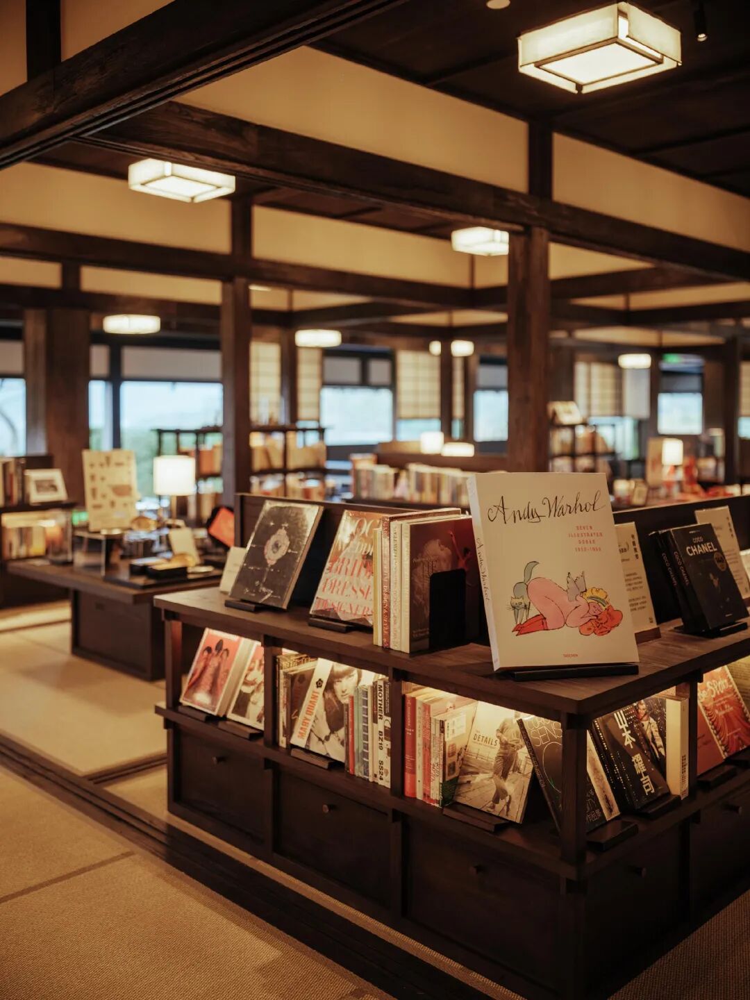 古老的木头立柱支起整体结构,暖色灯光与自然天光交织,安宁幽静。拙朴的低矮书架上,交错地陈列着从世界各地淘来的小众原版书籍,其中不乏年代悠久的中古书,涵盖文学、人文、建筑、设计等多个领域。
