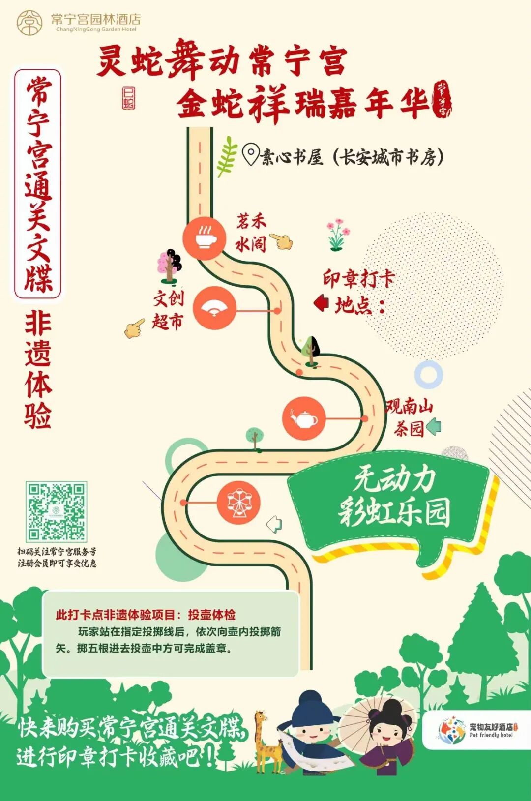 常宁宫通关文牒(需银子),在素心书屋及商超销售,参与非遗活动,以常宁宫门头、小常小宁、四大神兽、最美夕阳打卡地等印章为引线,贯穿常宁宫无动力彩虹乐园(投壶互动)、观南山茶园(拓印新春福卡)、茗禾水阁(制作树叶生态纪念书签)各项点位进行活动。快快按照通关文牒专用地图,进行网红印章收藏打卡吧。
