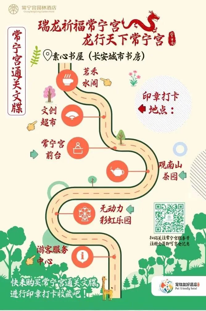 ②常宁宫通关文牒(需银子),在素心书屋及商超销售,以常宁宫门头、小常小宁、四大神兽、最美夕阳打卡地等印章为引线,按照通关文牒路线图,在常宁宫各点位进行盖章打卡。快快按照通关文牒专用地图,进行网红印章收藏打卡吧。