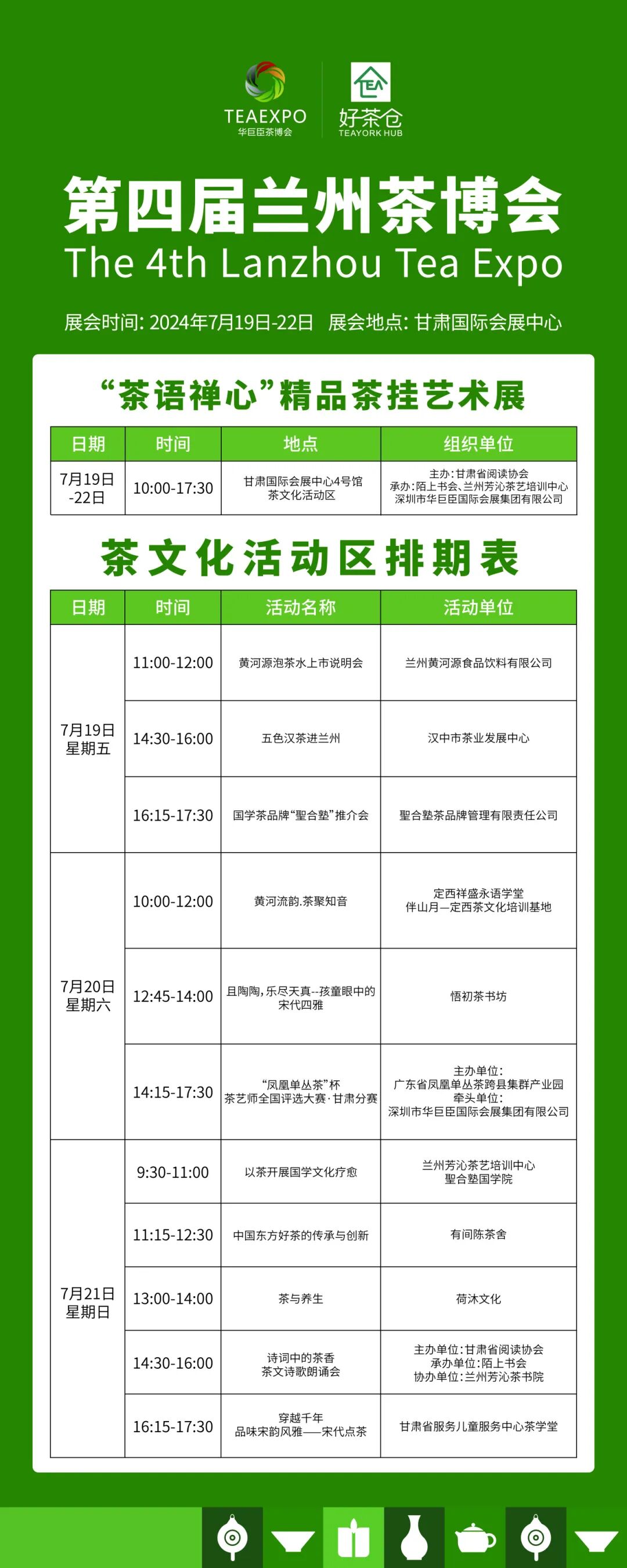 第四届兰州茶博会将持续到7月22日,精彩仍在继续。7月20日,2024“凤凰单丛茶”杯茗星茶艺师全国评选大赛·甘肃分赛(决赛)现场,初赛十强选手将同台竞技、一展风采,角逐最终的冠军宝座!7月20日-21日,兰州茶文化学堂将为大家奉上“黄河流韵.茶聚知音”、“茶与养生”、“以茶开展国学疗愈”、“中国东方好茶的传承与创新”、“茶文诗歌朗诵会”、“且陶陶,乐尽天真—孩童眼中的宋代四雅”、“穿越千年,品味宋韵风雅—宋代点茶”等系列活动,兼具科普性、趣味性、观赏性和体验性,千万别错过!