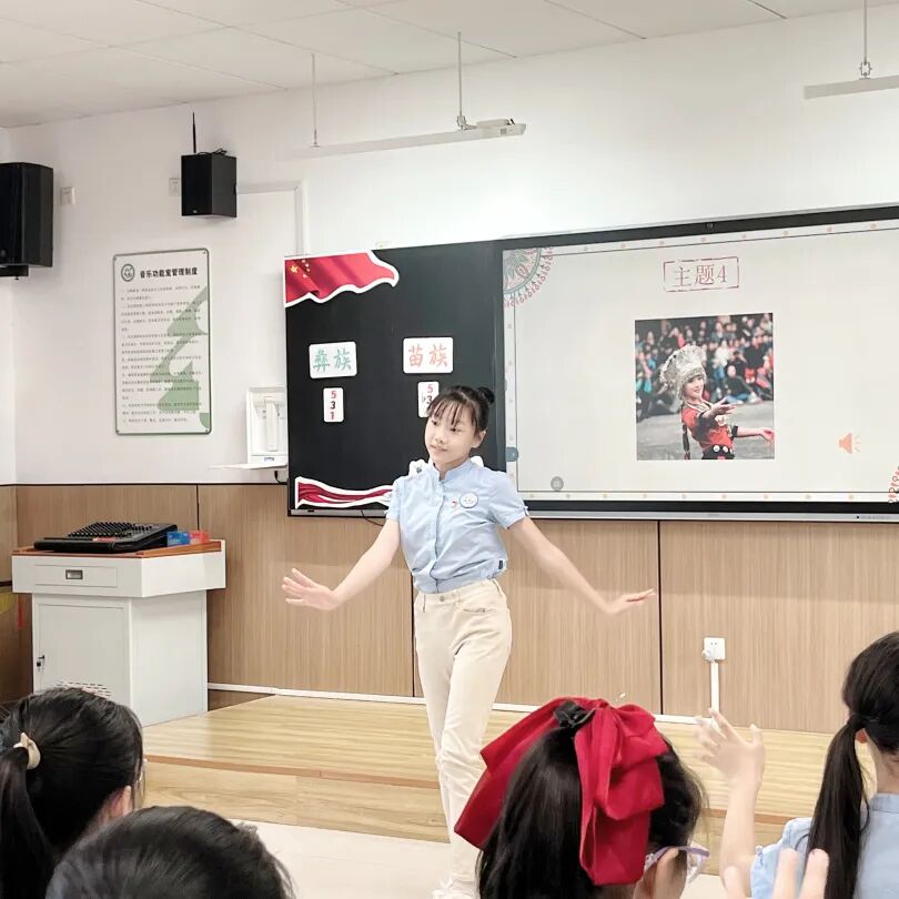 欢声不断,掌声不断......冯老师以声势律动、舞蹈场景、对比聆听、感受乐器音色为主要形式,充分地让学生去感知、思考、理解、表演,在活动中引导学生体会苗族、彝族音乐特色,增强学生的音乐审美能力,体会多民族融合的音乐氛围,提升民族文化自信,铸牢中华民族共同体意识。