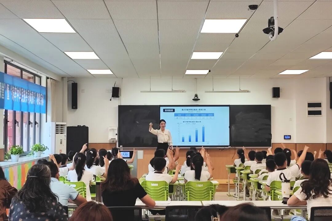 数学组参赛教师灵活激趣,勾连生活数学,以合作探究性学习为方法,将实际问题转化为数学问题,让学生感受知识的形成过程。数学组独具匠心的教学设计,贴近儿童的问题设置,趣味活力课堂氛围,让“大树生长课堂”学习真正发生。