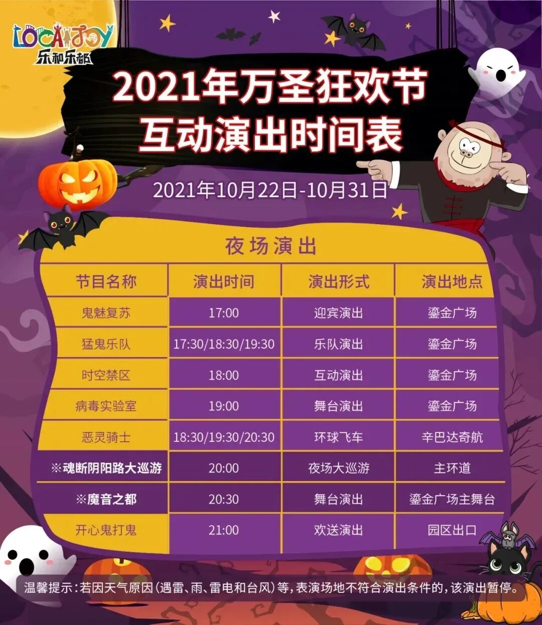 万圣节期间,日场不清场,持乐和乐都年卡的会员请在17:00以前,凭本人年卡免费入场,夜场开始检票后须另行购票。