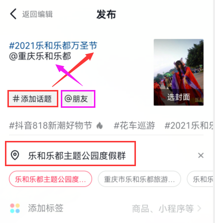 1. 在发布页面,点击“添加话题”然后在#号后输入“2021乐和乐都万圣节”并@重庆乐和乐都官方抖音号,添加定位“乐和乐都主题公园度假群”。(未添加话题和定位的不做评选)