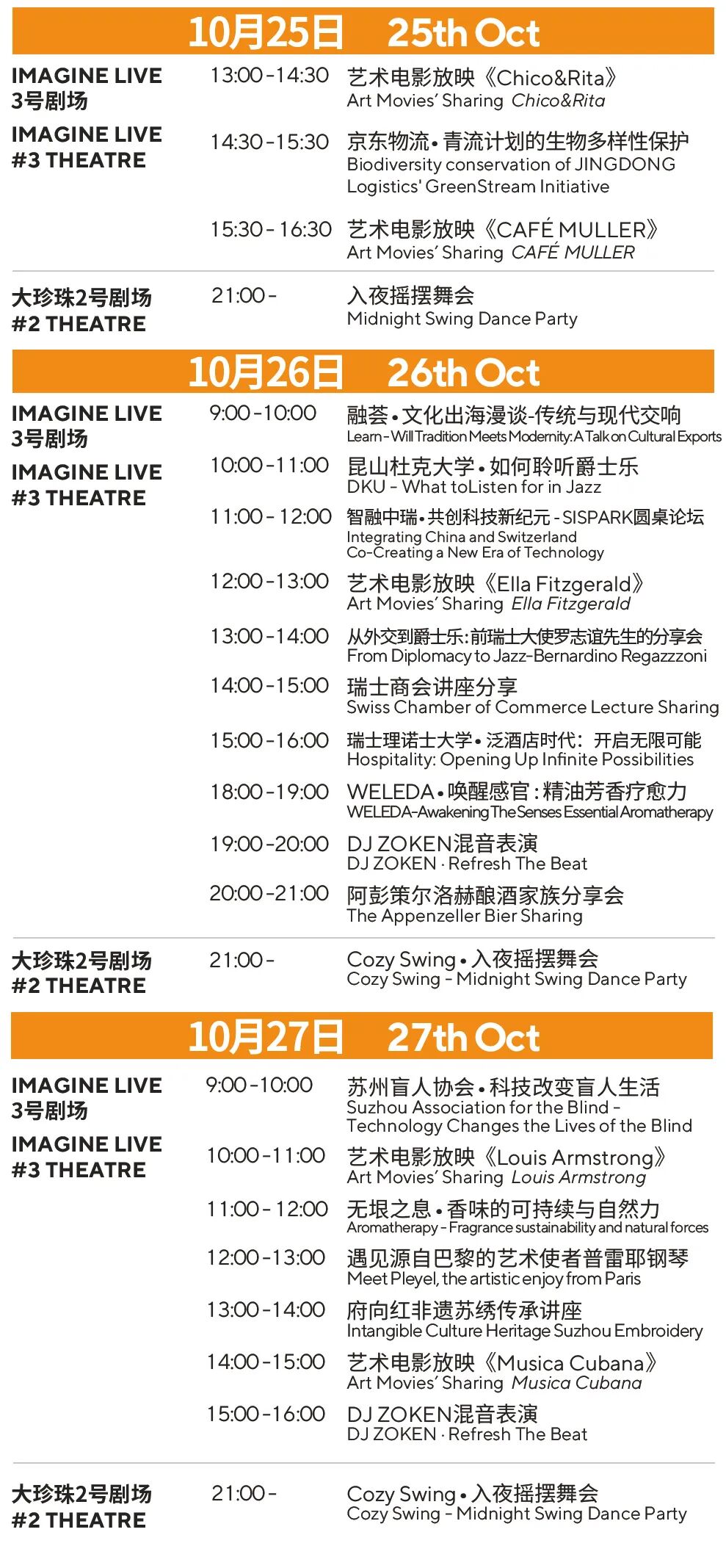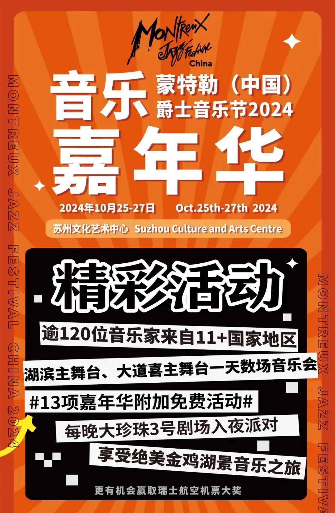 除了每场至少一小时的音乐会,还有全景导览、论坛讲座、“日出普拉提”疗愈体验、环湖自行车音乐之旅、金鸡湖畔摇摆舞会、3D创意装置设计workshop、“我的苏州视觉日记”摄影大赛、艺术电影、慈善舞台、年度海报签名会、高端家庭音响展、蒙特勒特色市集、文创生活市集等丰富多彩的嘉年华活动等你参与!