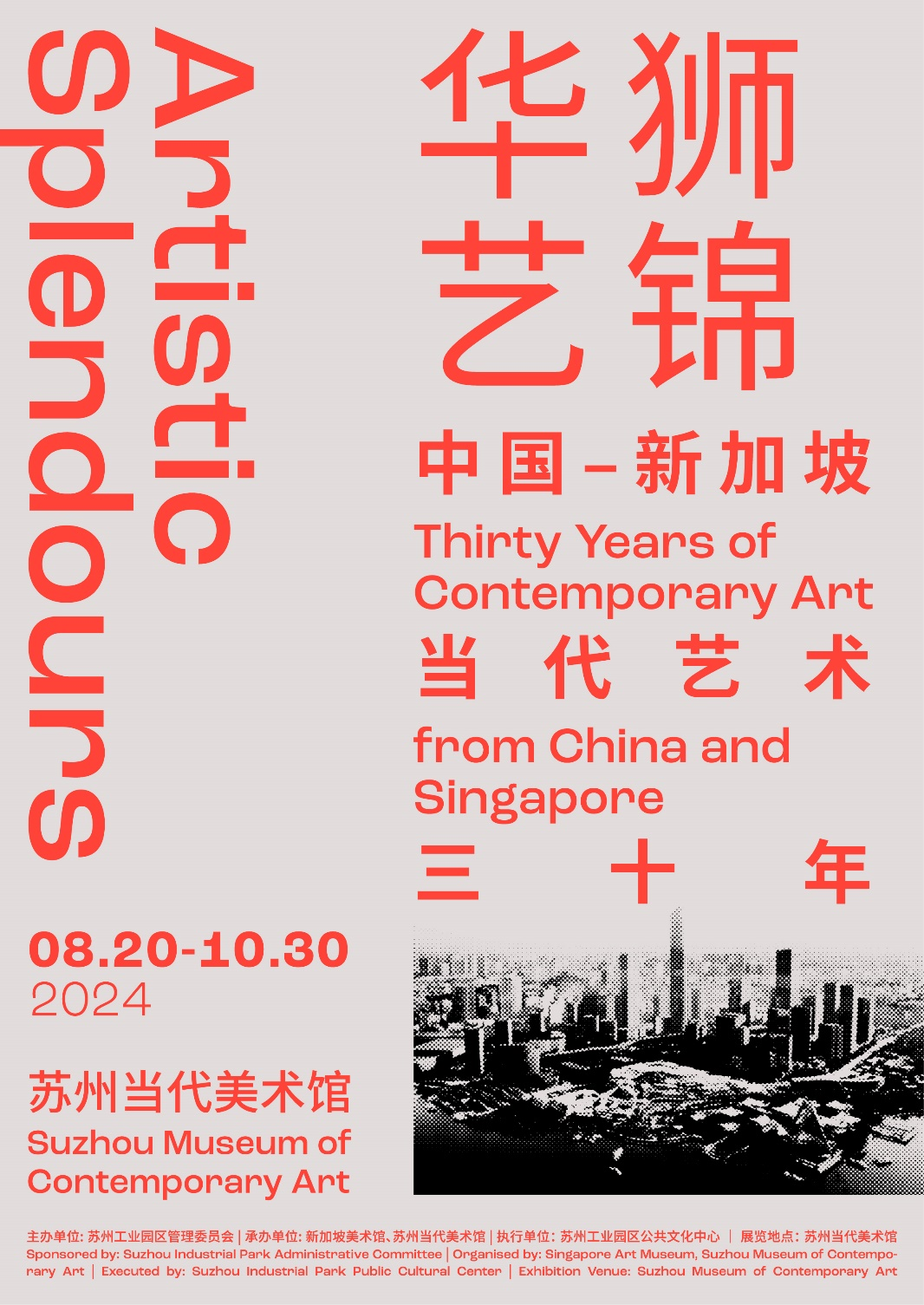 2024年,以献礼苏州工业园区开发建设三十周年为契机,《华狮艺锦——中国新加坡当代艺术三十年》展览在园区金鸡湖畔苏州当代美术馆举办,与三十年前的《狮城艺萃》遥相呼应、再度重逢。中新艺术展进一步为推动中新两国文明的交流互鉴作出新的更大贡献。