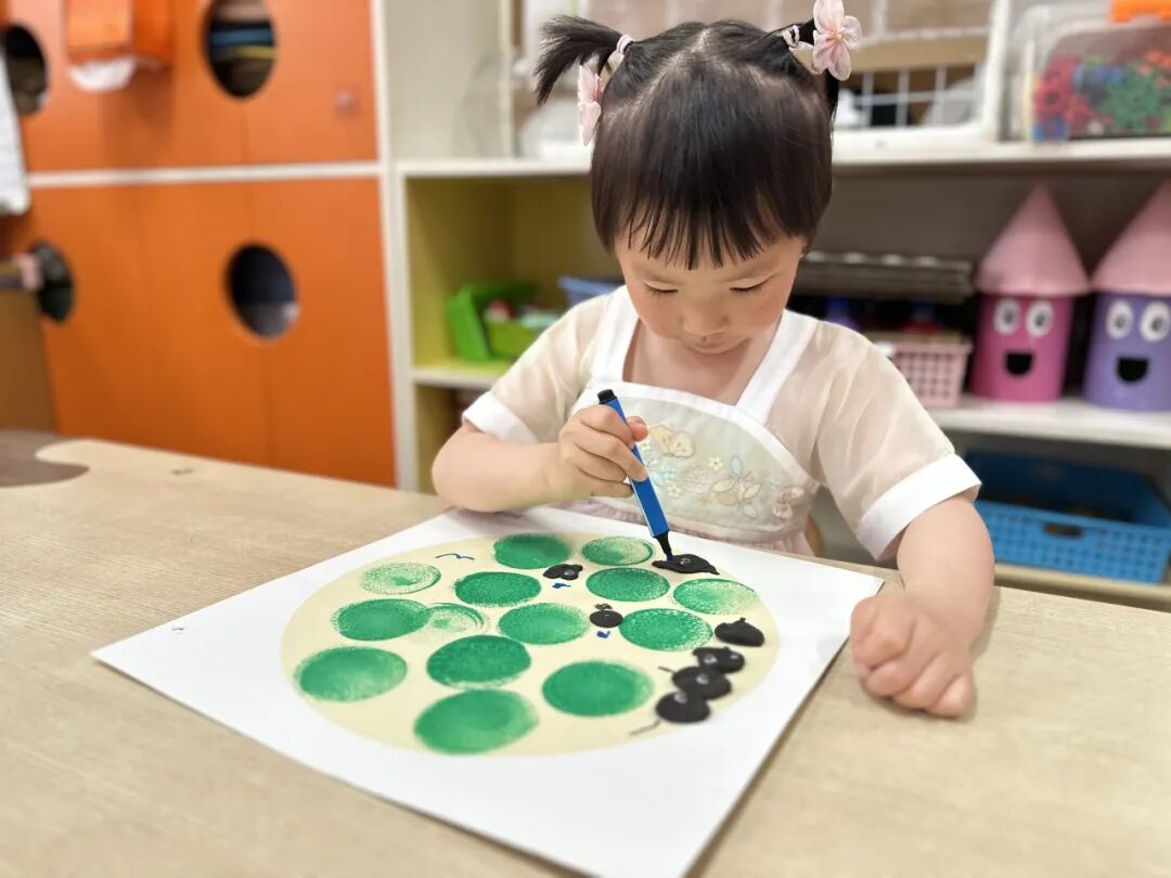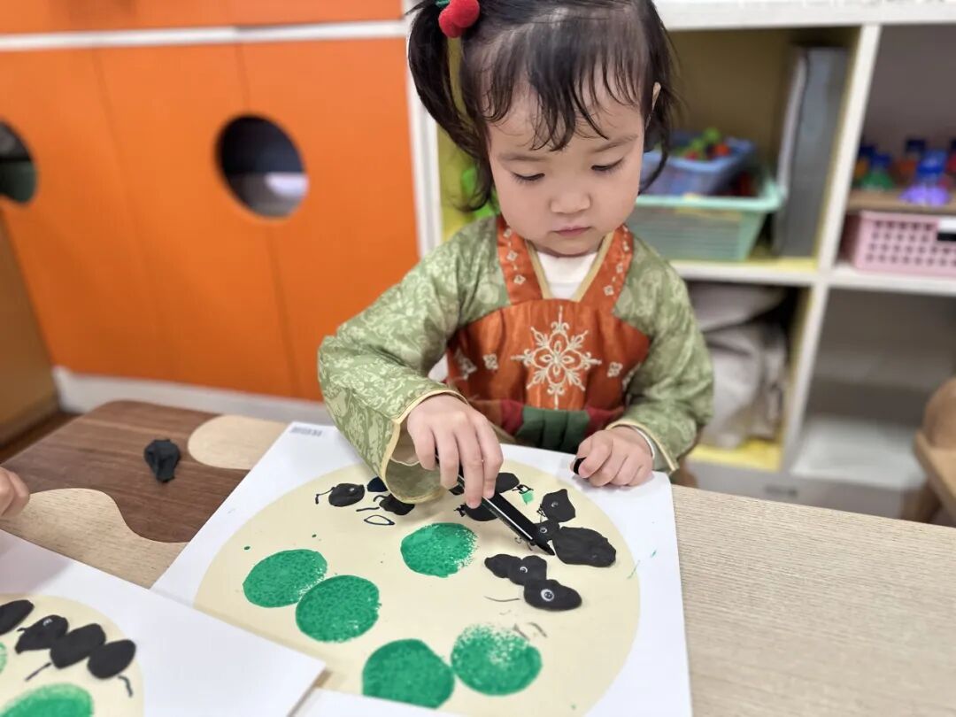 小宝贝们化身小小艺术家,用稚嫩的小手绘制荷叶和小蝌蚪。颜料抹一抹,海绵棒印一印,不一会儿,一片片深深浅浅的荷叶就出现了;再用黑色黏土搓一搓,贴上灵动的小眼睛,一条条小蝌蚪仿佛要从纸上跳进 “池塘”。