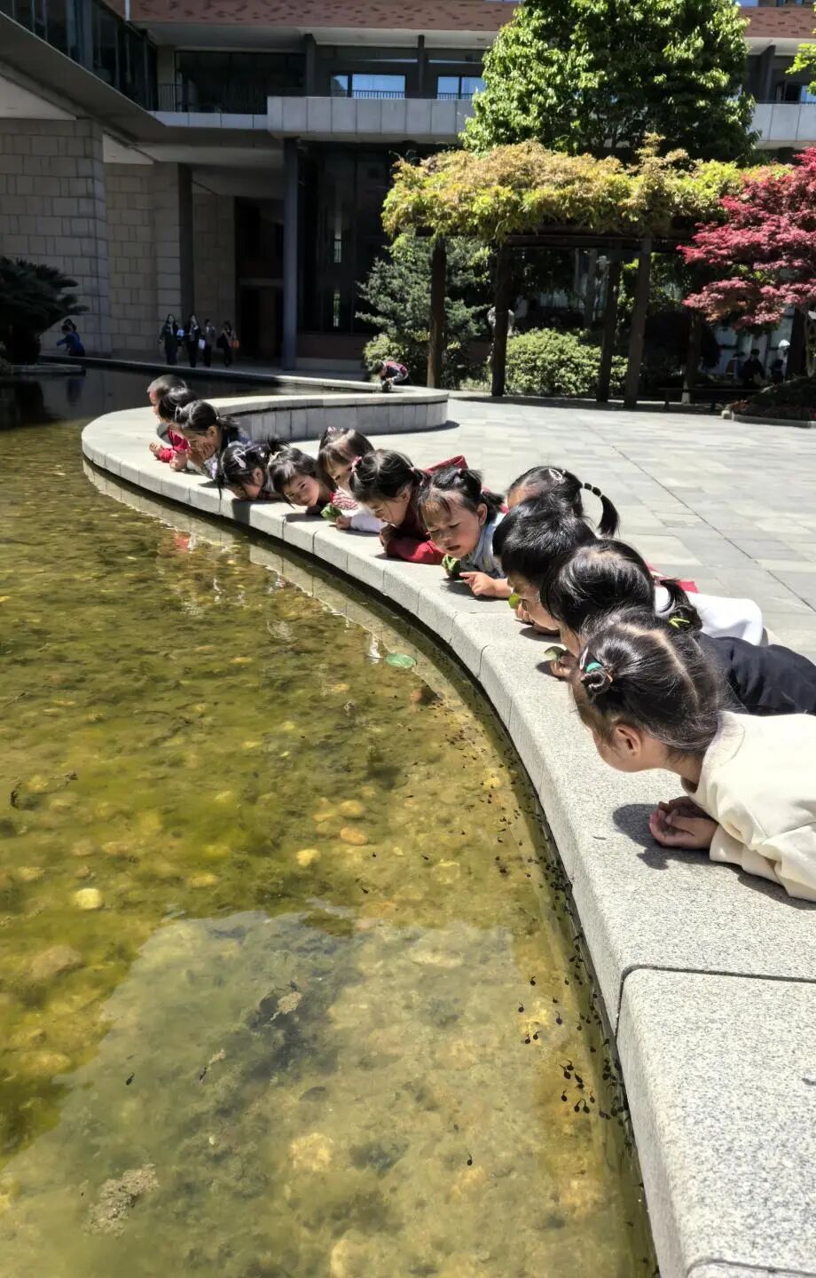 我们来到大池塘边寻找蝌蚪。微风轻拂,水波荡漾,孩子们小心翼翼地蹲在池塘边,睁大眼睛搜寻着,时不时传来惊喜的呼喊:“我找到啦!”“这里还有好多!” 在与自然的亲密接触中,一颗颗探索生命的种子,在孩子们心中悄然种下。