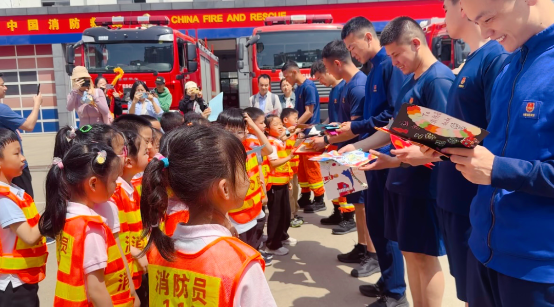 全体的小朋友们一同为消防员们送上了暖心的贺卡和锦旗。