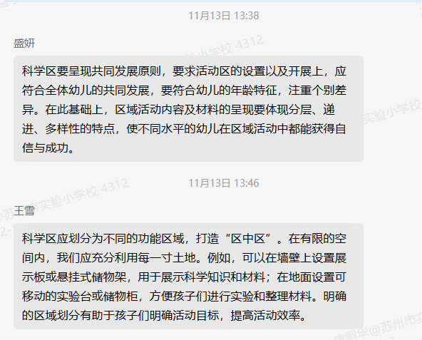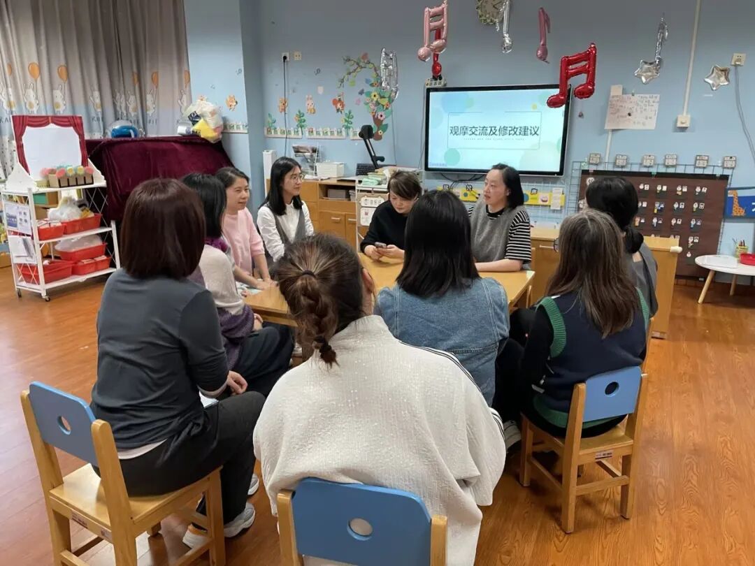 这既是老师之间的研讨学习,也是思维碰撞的平台。大家一起寻找各班区域创设可以进一步优化的问题点,提出了“空间布局、材料投放,教师指导”等困惑,作为下一步区域优化的研讨重点。