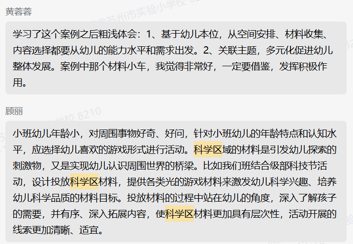 观摩活动结束后,老师们分别以小、中、大三个年龄段的科学区域活动为切入点,通过观察、分析幼儿与材料的互动情况,梳理区域中材料投放的亮点及价值,同时聚焦问题,全园共同对话,进一步分享了具体建议。